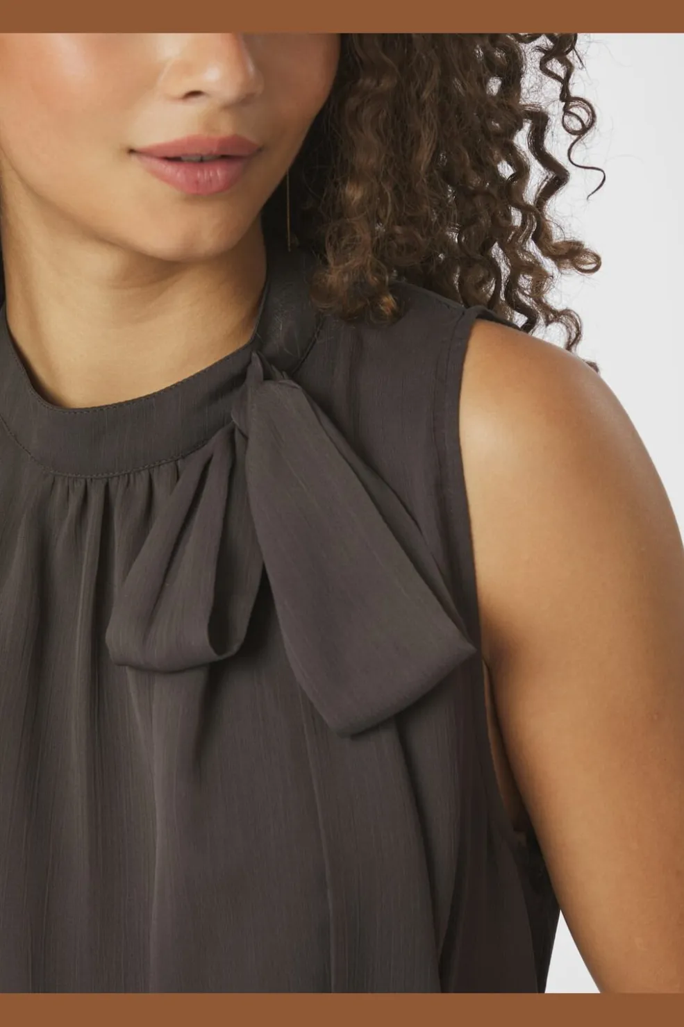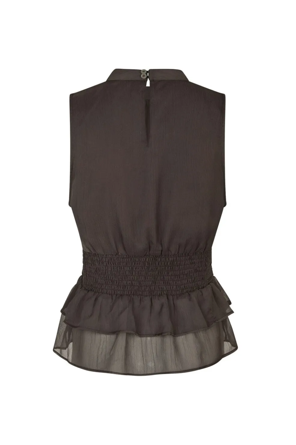 Mørkebrun chiffon-top fra Neo Noir med høj hals og bindebånd. Toppen har en slim fit-pasform og flæser i bunden, der skaber et lag-på-lag-look.