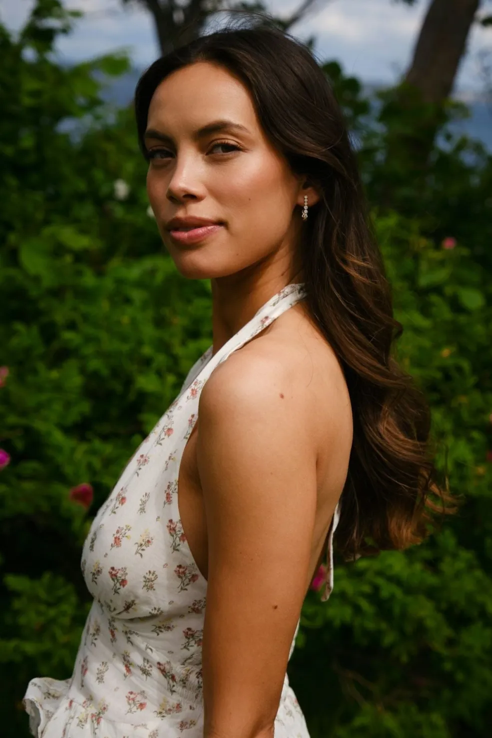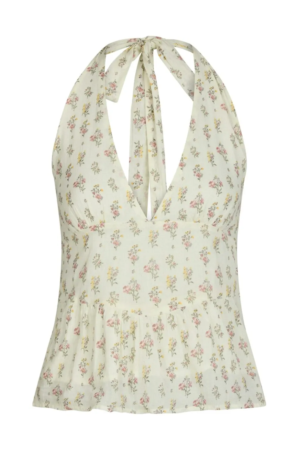 Cremefarvet halterneck-top fra Neo Noir med små blomsterprint. Toppen har en løs pasform med flæsekant forneden og bindebånd i nakken til justering af pasformen.