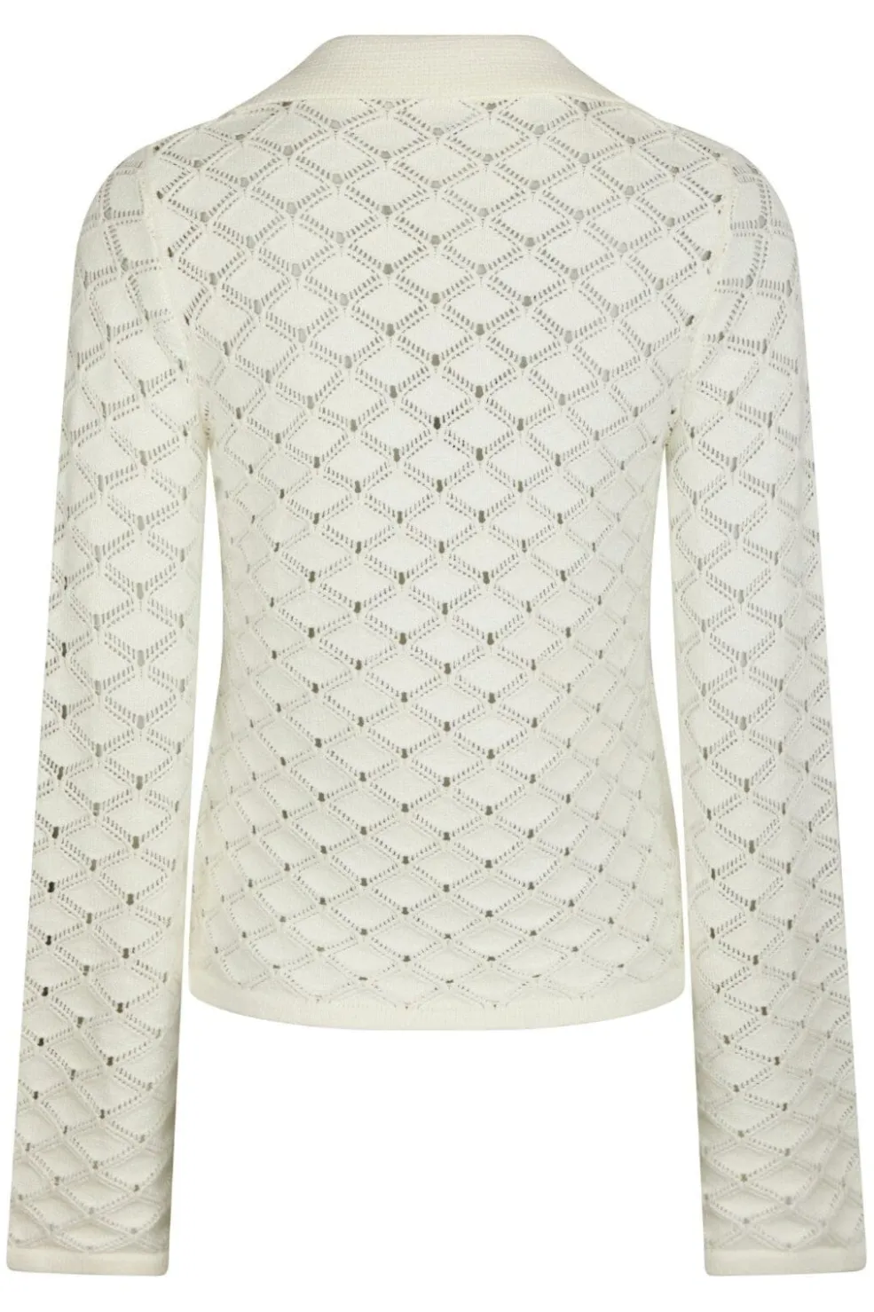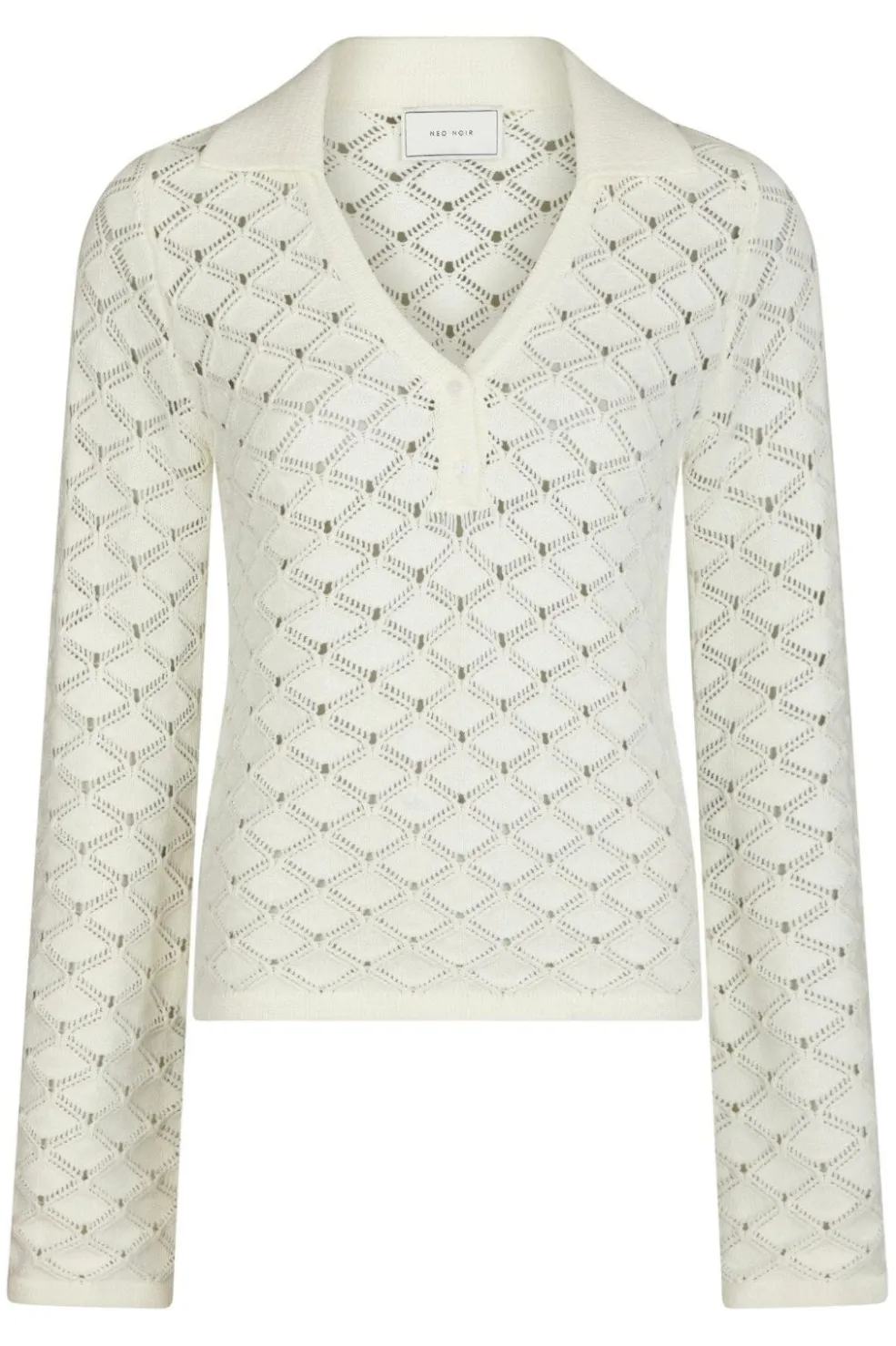 Strikket bluse fra Neo Noir i off-white. Blusen har en V-hals med knaplukning foran og lange ærmer. Det diamantformede strikmønster giver struktur til designet.