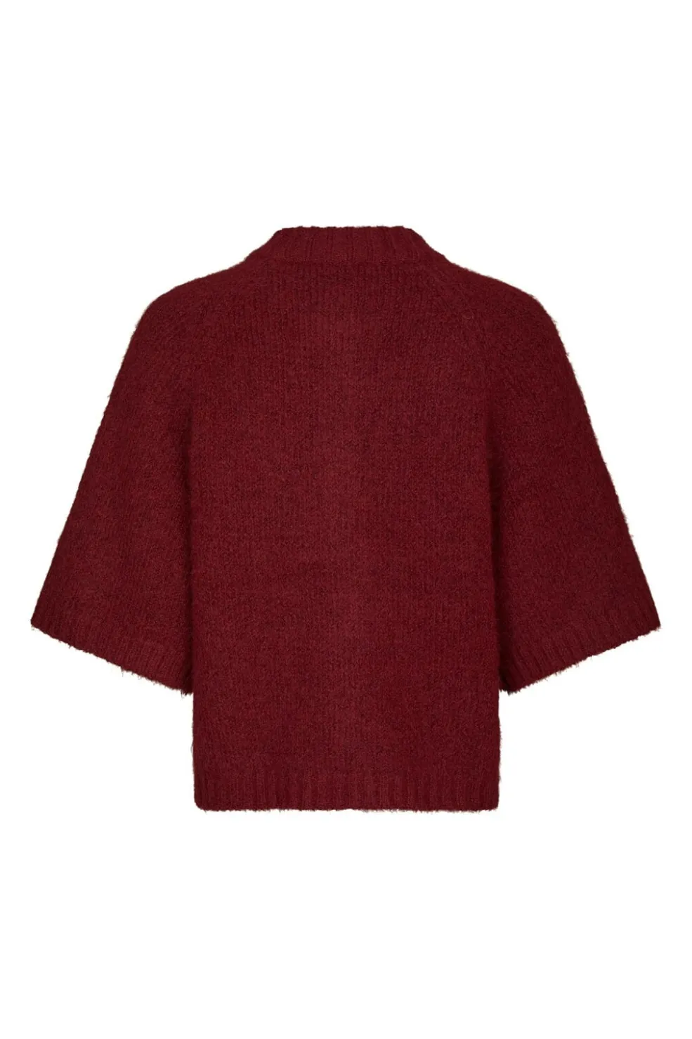 Mørkerød cardigan fra Neo Noir med fluffy strikket tekstur. Den løse pasform med korte ærmer og høj hals giver god bevægelsesfrihed til både hverdag og fest.