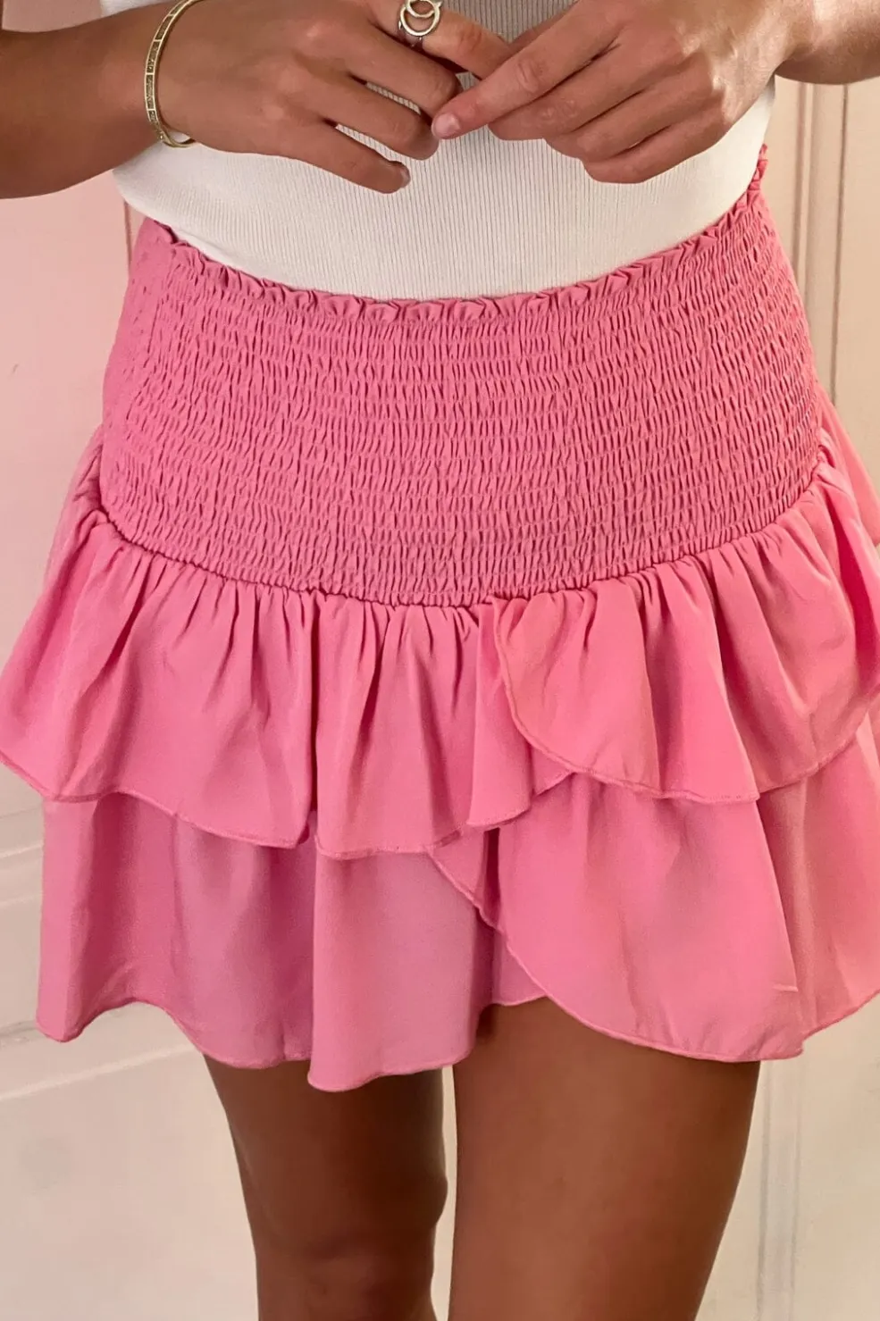 Lyserød nederdel fra Neo Noir med to lag flæser og slids. Den smockede talje og det lette stof giver nederdelen et feminint udtryk og god bevægelighed.