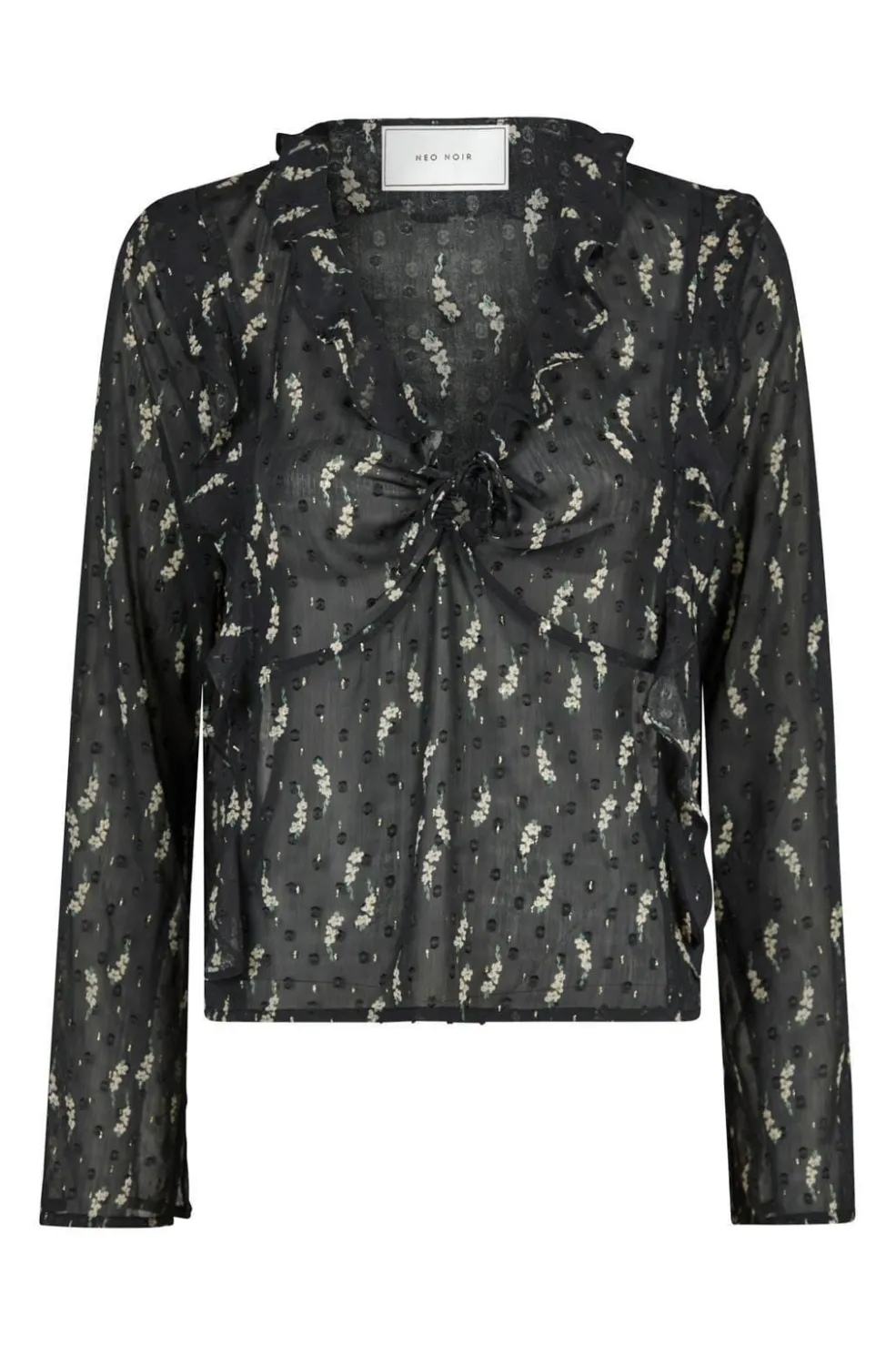 Sort bluse fra Neo Noir med lyse blomstergrene på sort baggrund. Blusen har flæsedetaljer ved halsen og snørelukning foran. De lange ærmer og v-udskæringen giver blusen et feminint udtryk.