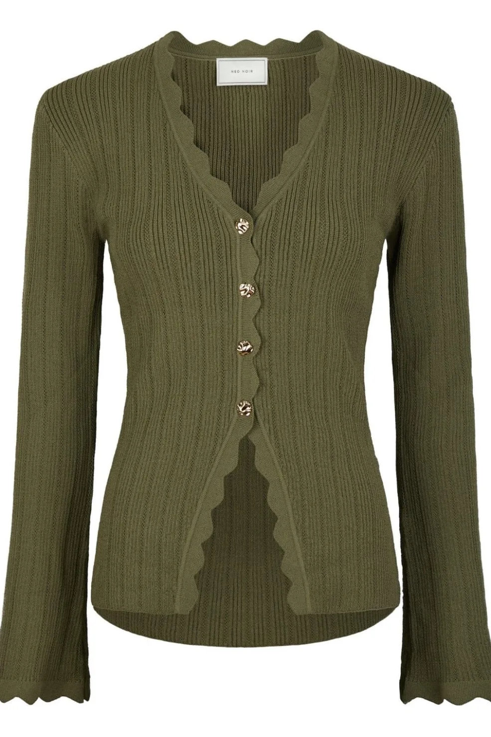 Strikket bluse fra Neo Noir i olivengrøn. Den ribbede bluse har flared ærmer med bølget kant og dekorative syninger gennem hele designet.