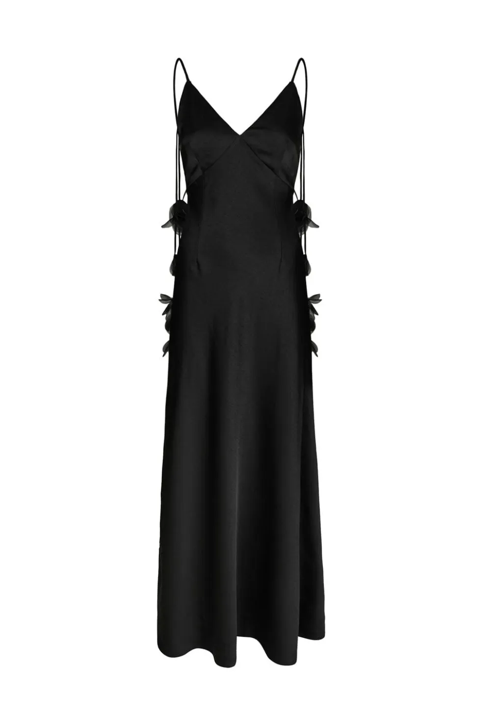 Sort gulvlang kjole fra Neo Noir i tung crepe-satin. Kjolen har V-udskæring, spaghetti-stropper med blomsterdetaljer og bindebånd på ryggen.