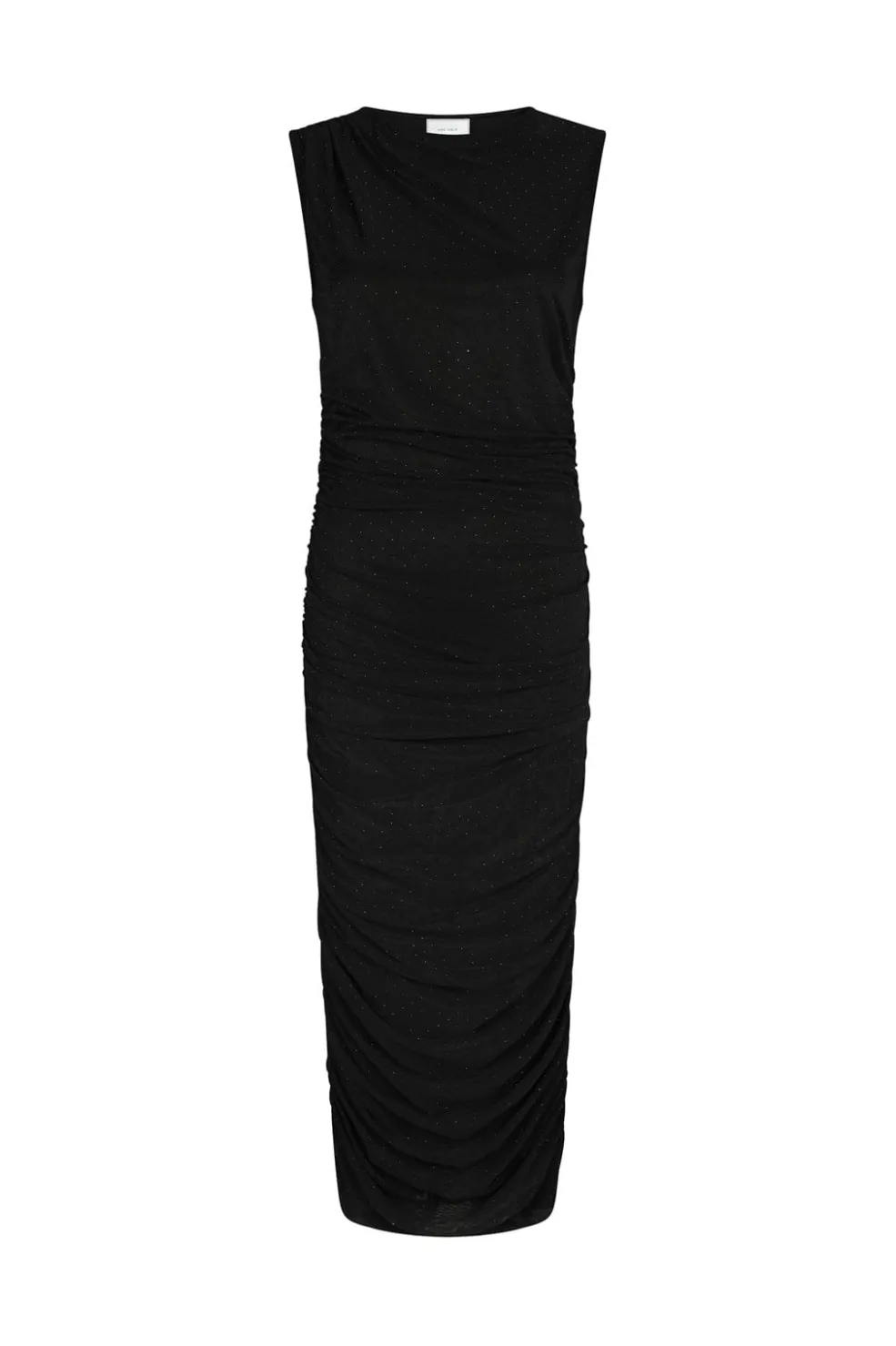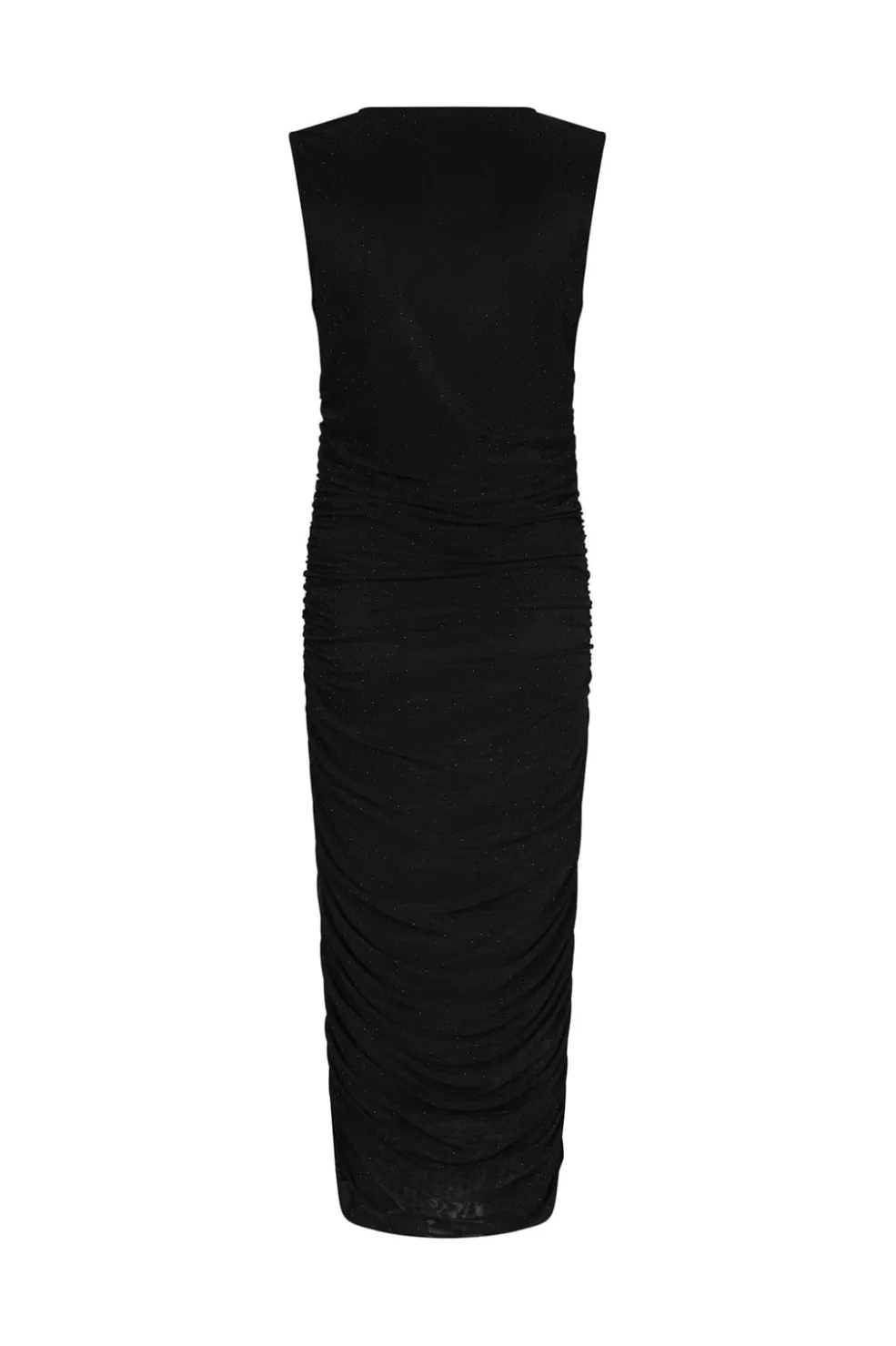 Sort meshkjole fra Neo Noir med påsyede sten og rynkeeffekter. Kjolen har en lang, kropsnær pasform med rund halsudskæring og er ærmeløs.