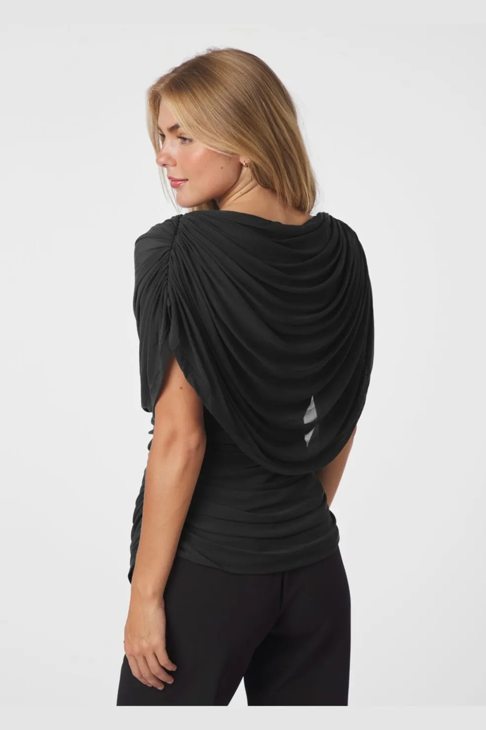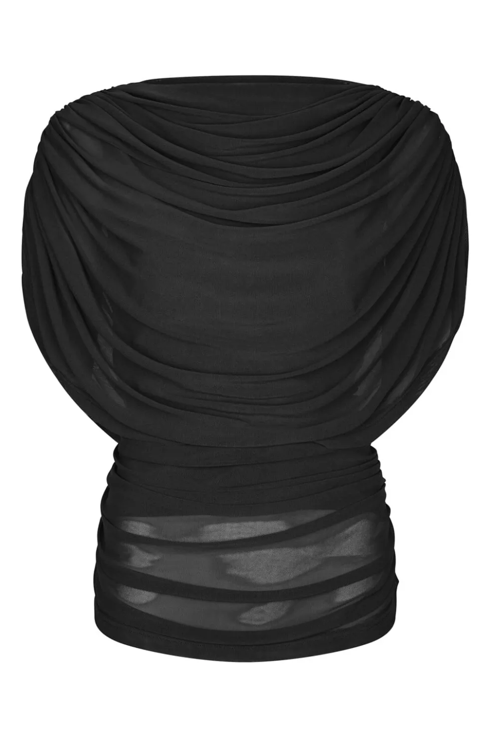 Sort mesh-top med draperet design og bådudskæring. Toppen har rynker langs sidesømmen og en vandfaldseffekt foran, der skaber et blødt fald i stoffet.