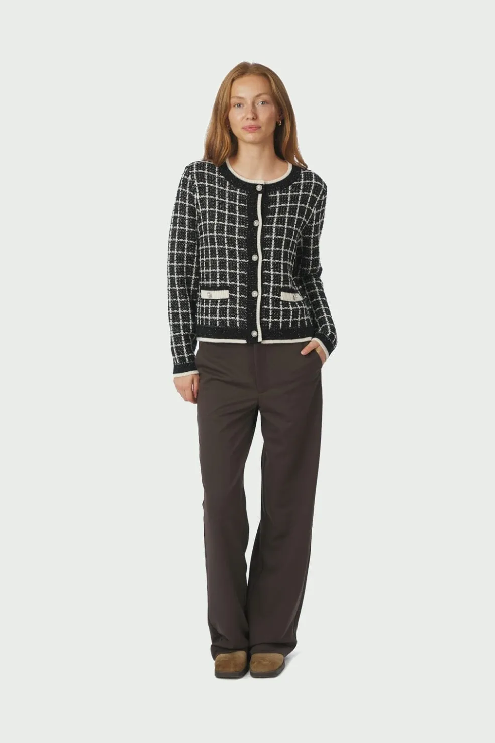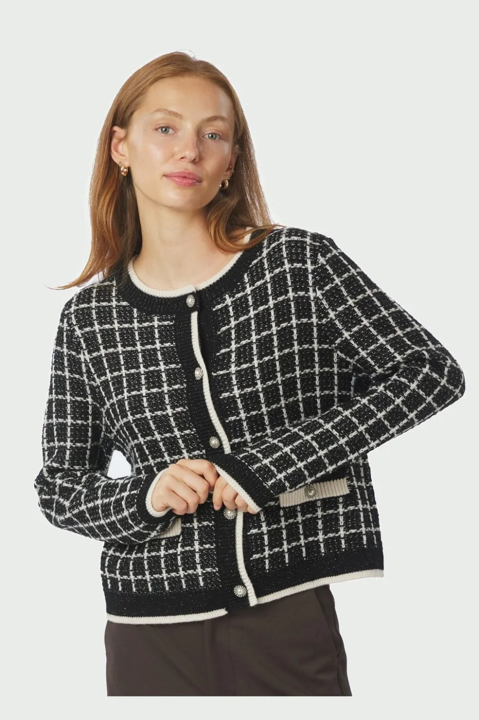 Sort strikket cardigan fra Neo Noir med hvidt ternet mønster. Cardiganen har rund halsudskæring, perleknapper og lommer foran.