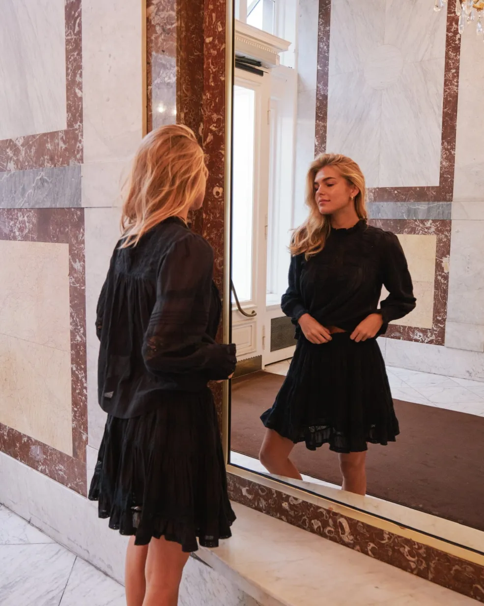 Mørkeblå voile-bluse fra Neo Noir med høj hals og flæser. Blusen har blonder på ærmerne og foran, samt dekorative syninger, der giver et feminint udtryk.