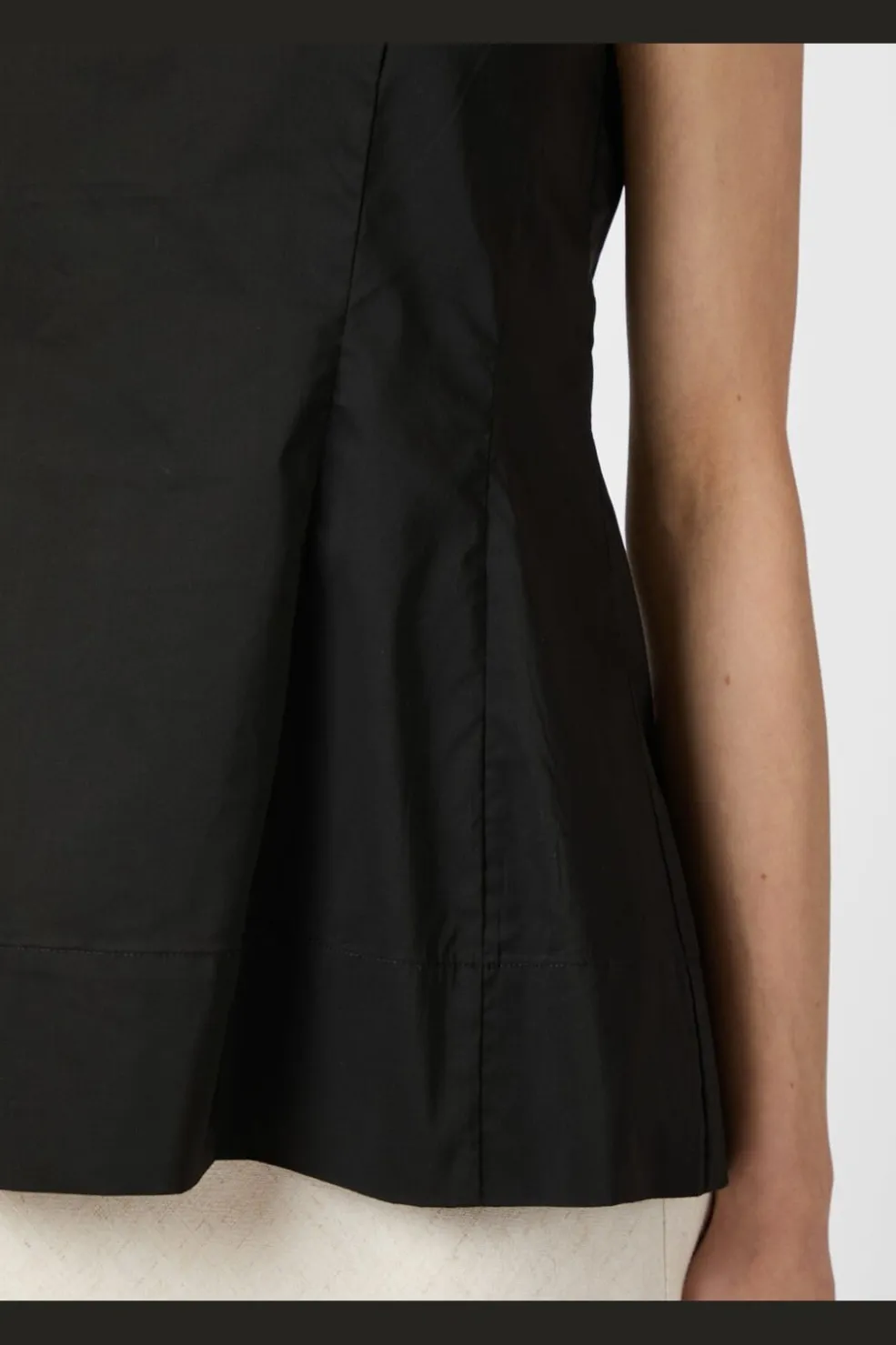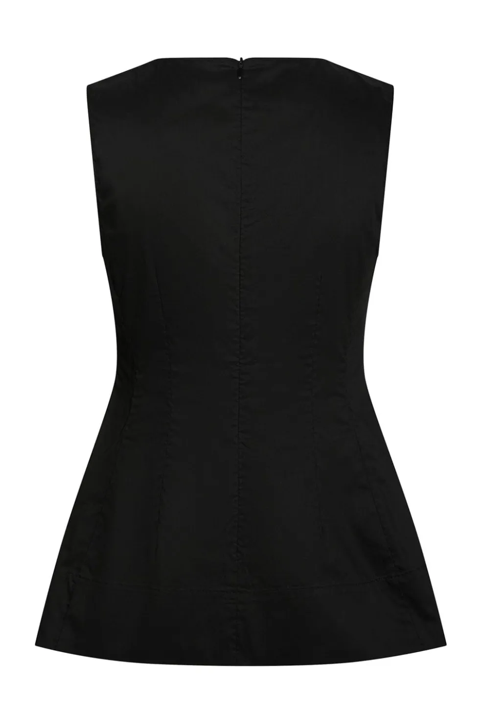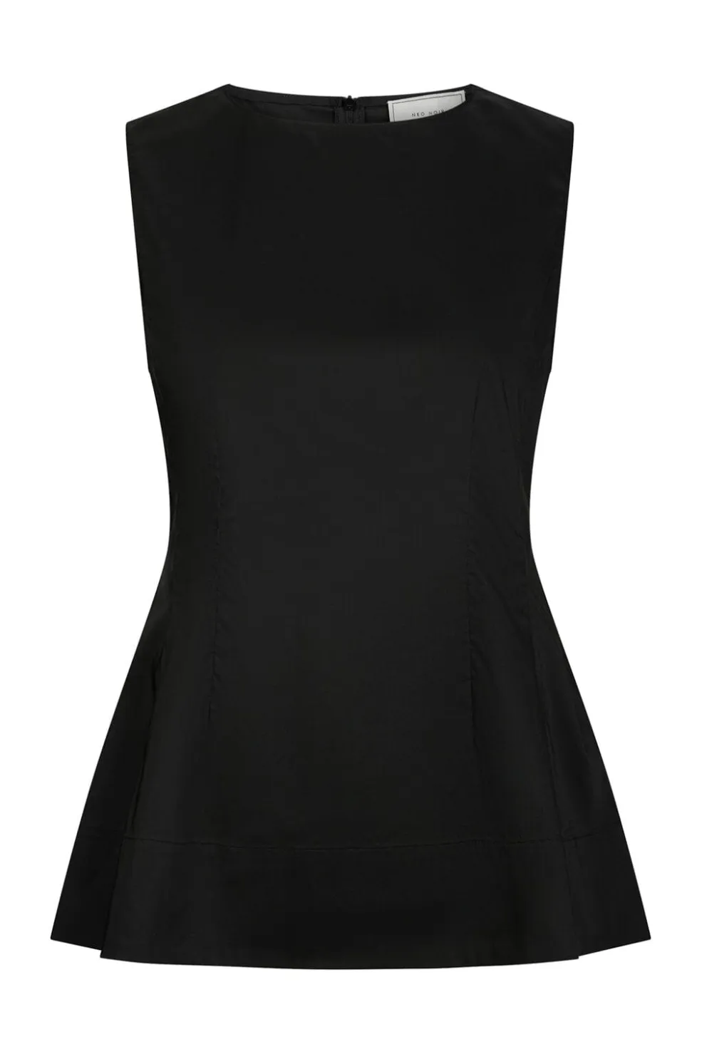 Sort ærmeløs top fra Neo Noir med peplum-design. Den tætsiddende overdel udvider sig ved taljen og har en rund halsudskæring. Toppen lukkes med lynlås i ryggen.