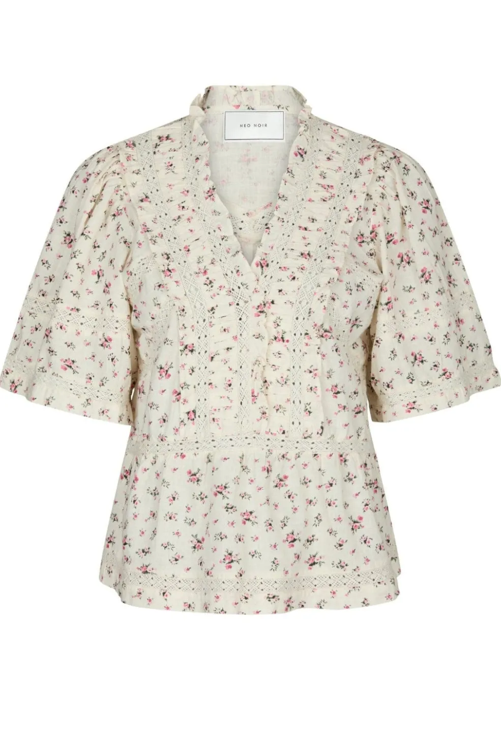 Blomstret top fra Neo Noir i hvid med lyserøde blomster. Toppen har korte puffede ærmer og en v-hals med blondedetaljer. Designet kombinerer et let bomuldsstof med feminine detaljer.
