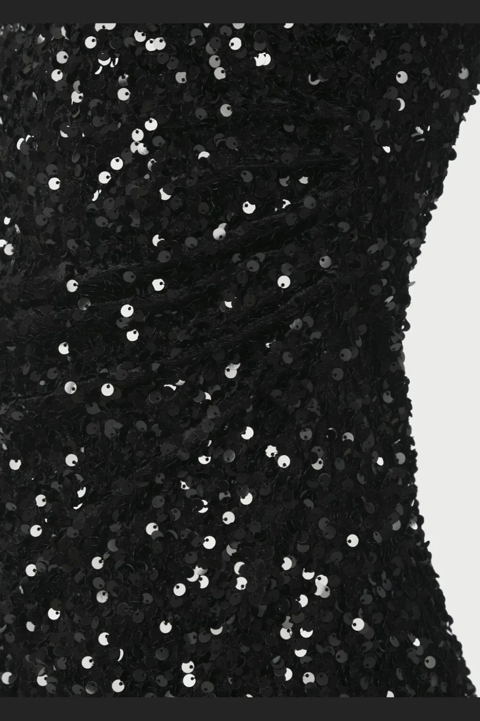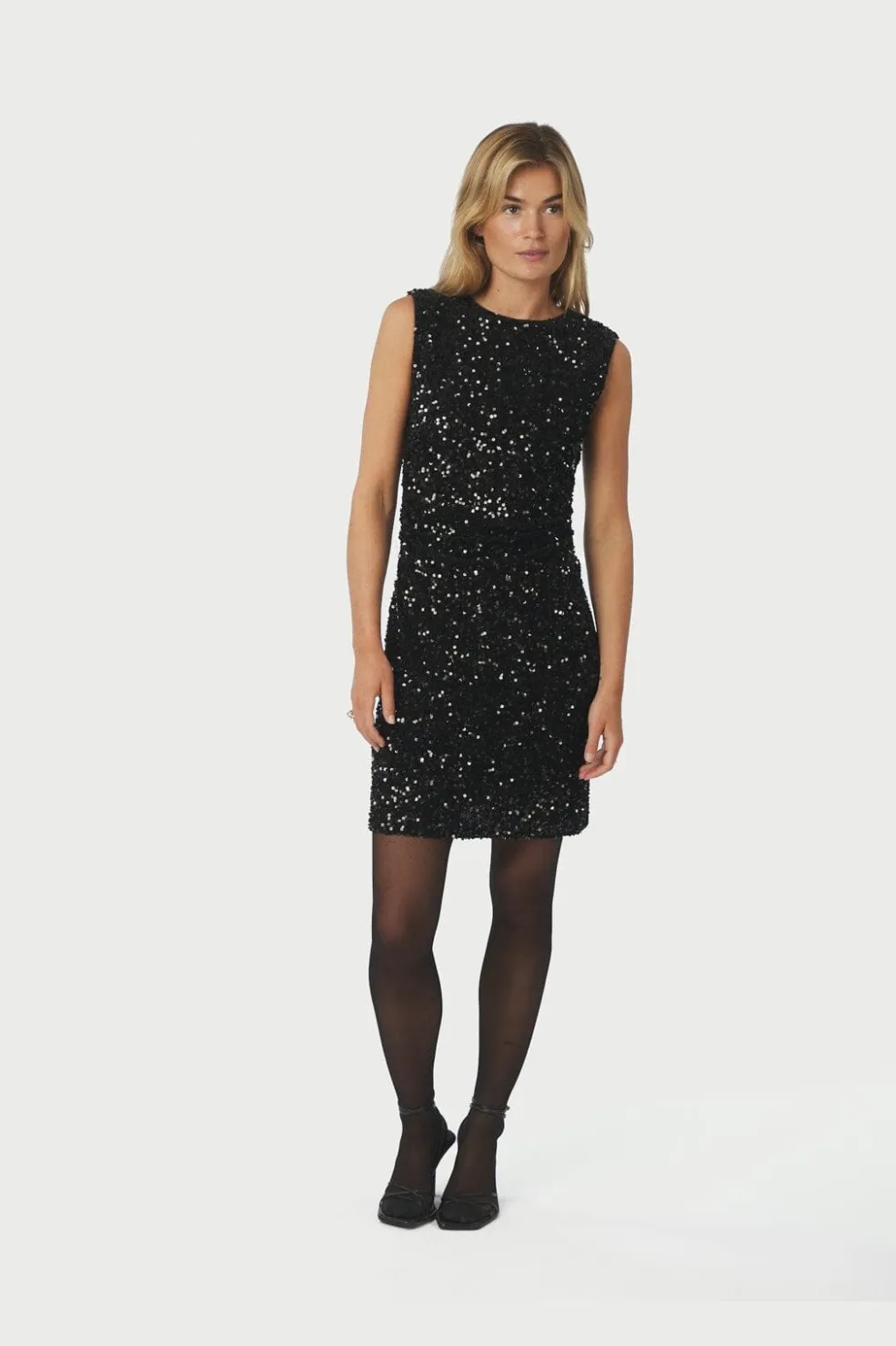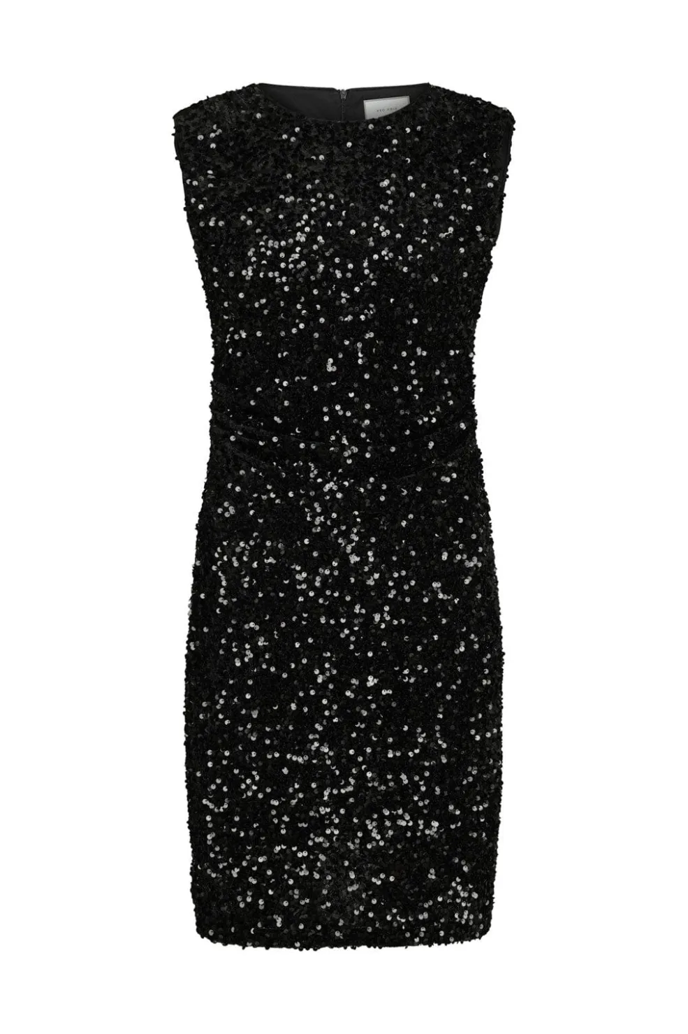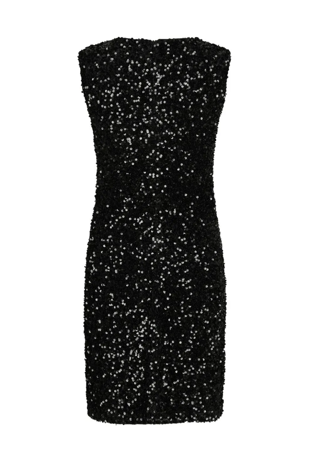 Sort velourkjole fra Neo Noir med pailletter over hele kjolen. Den tætsiddende kjole har rund hals og er uden ærmer. Lynlåsen på bagsiden gør den nem at tage af.