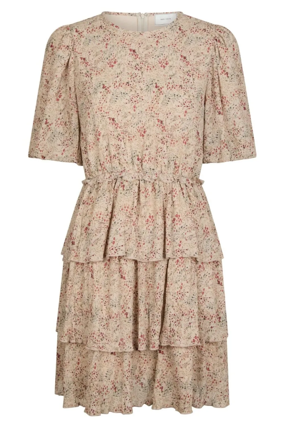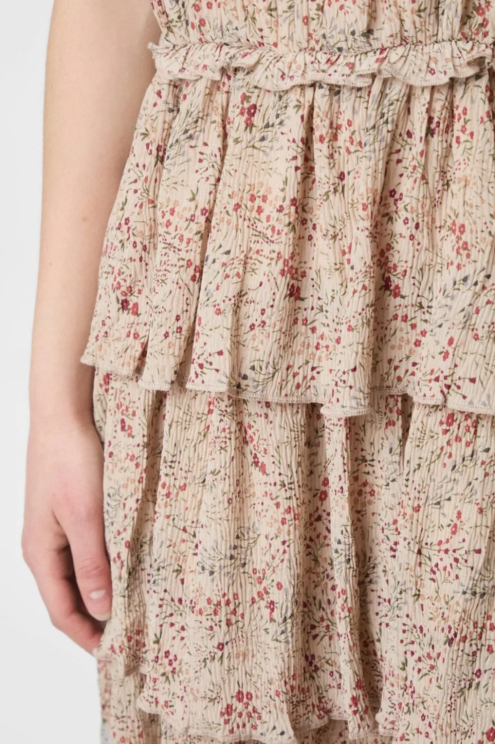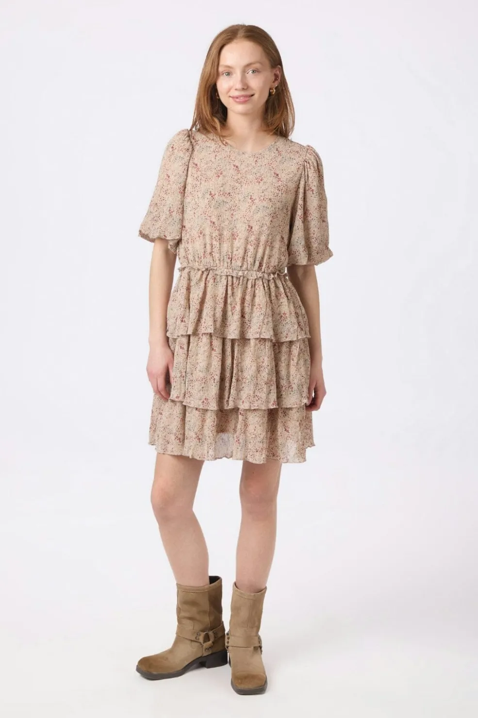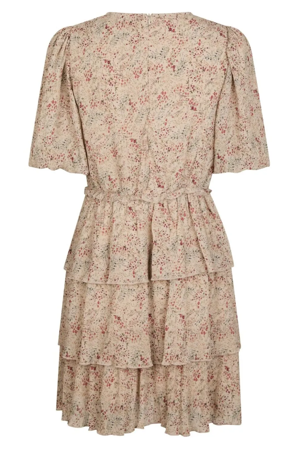Sommerkjole fra Neo Noir i sand med blomsterprint. Kjolen har tre lag flæser i underdelen, puffede ærmer og en elastisk talje med bindebånd.