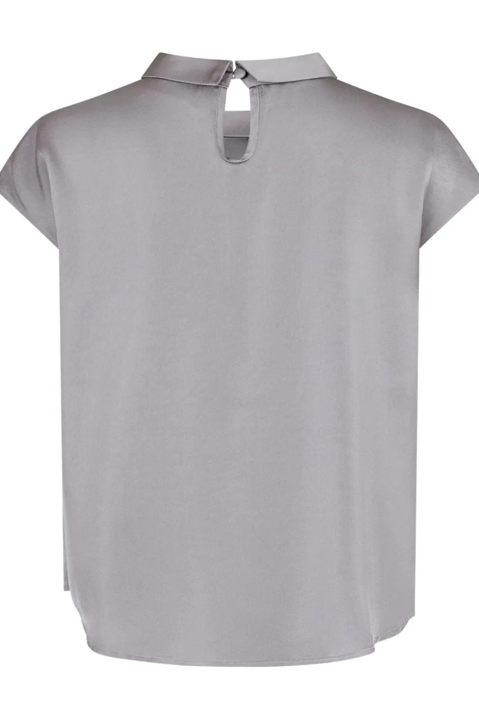 Grå satinbluse fra Neo Noir med høj hals og knudedetalje. Blusen har en løs pasform og korte ærmer, der giver god bevægelsesfrihed.