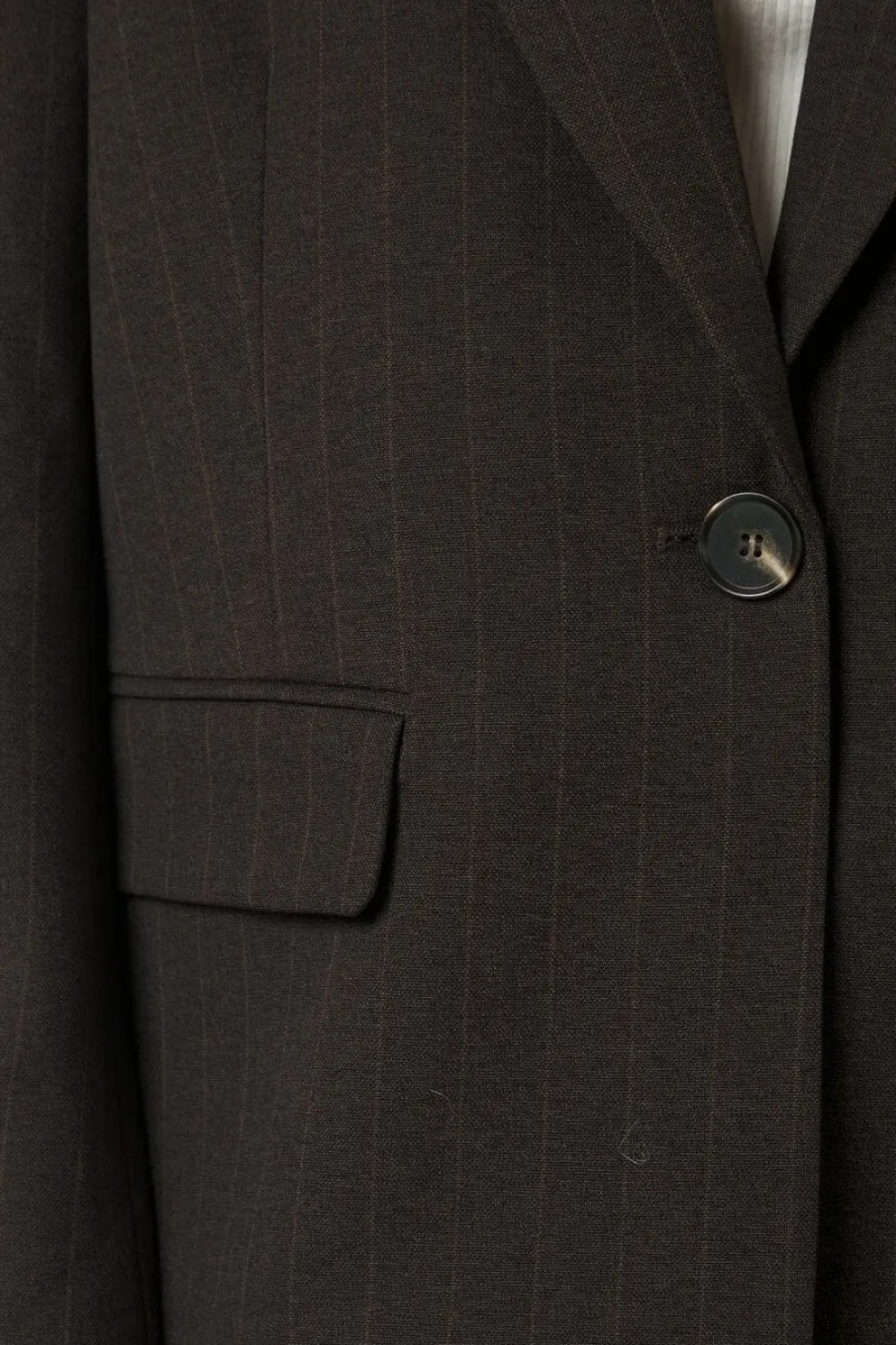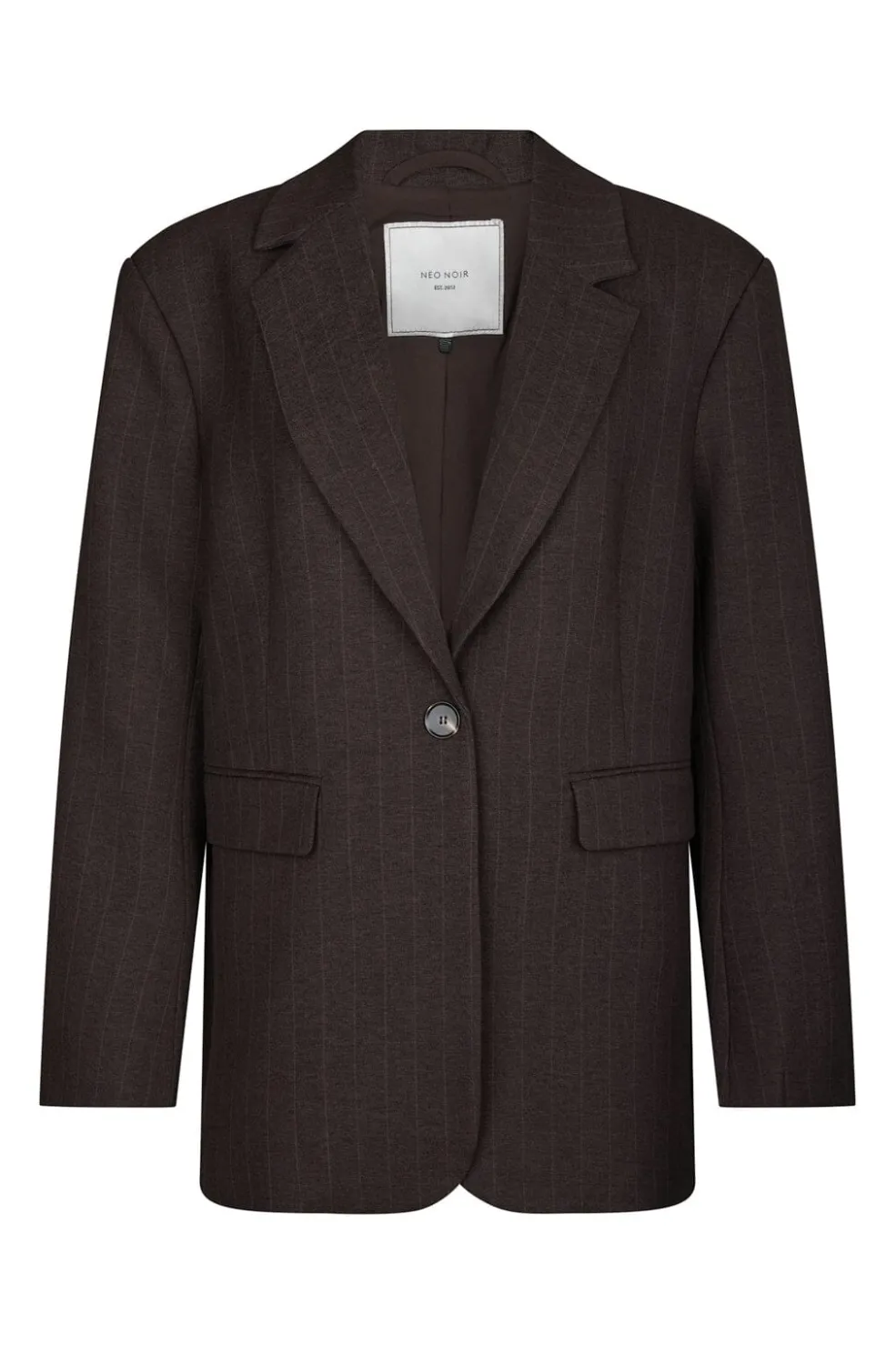 Mørkebrun blazer fra Neo Noir med pinstripe-mønster. Blazeren har en oversize-pasform og passer til både formelle og afslappede lejligheder.