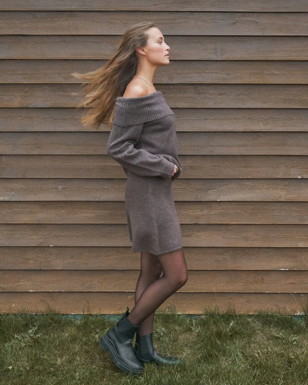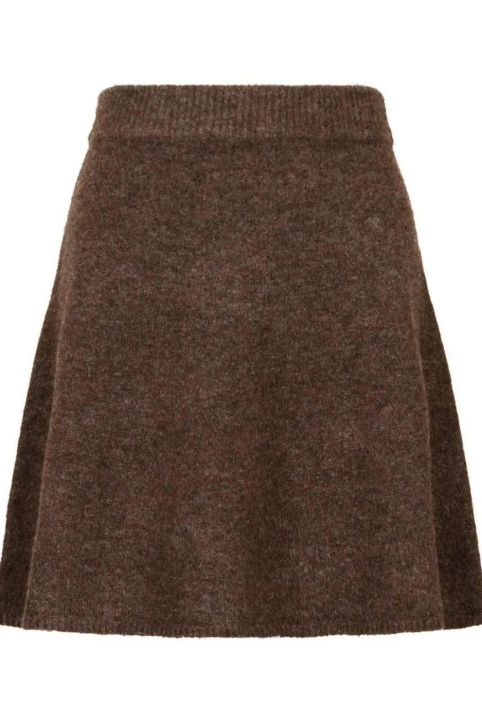Strikket nederdel fra Neo Noir i brun melange. En løstsiddende model i lårlængde med A-formet silhuet og elastisk talje.