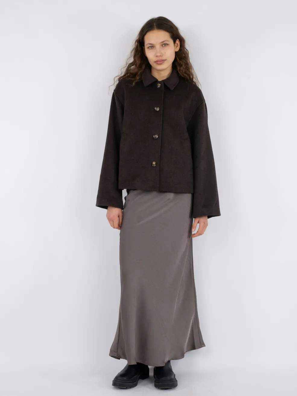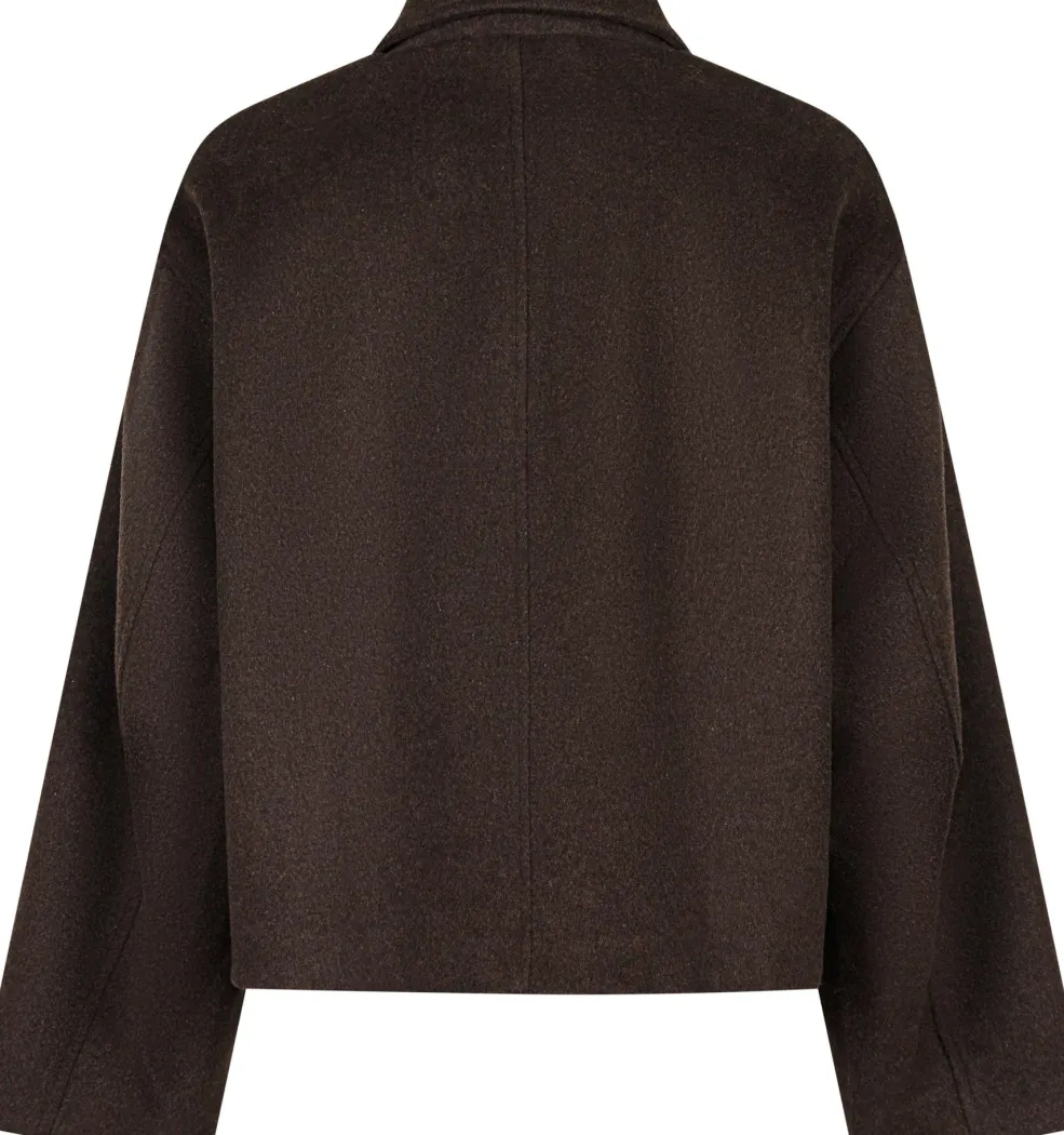 Uldjakke fra Neo Noir i chokoladebrun. Jakken har en løs pasform med skjortekrave og knaplukning foran. Den er fremstillet af en blanding af uld og polyester.