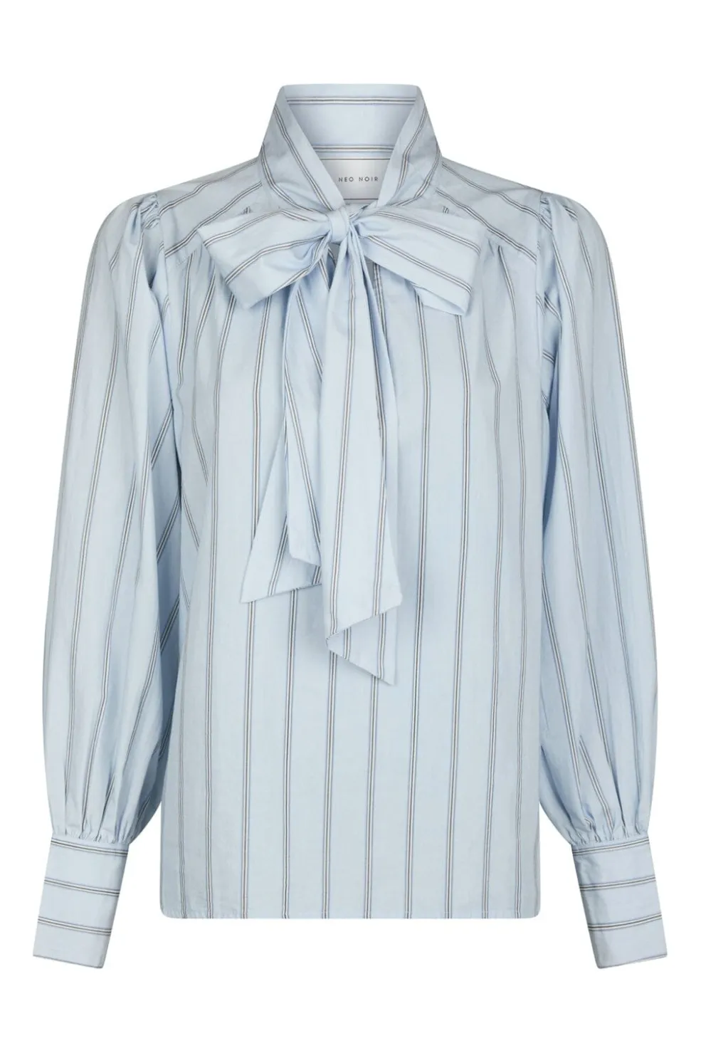 Lyseblå stribet bluse fra Neo Noir med skjortekrave og stor sløjfe. Blusen har pufærmer og manchetter ved håndleddene. Den er lavet i en let bomuldskvalitet med fine striber.