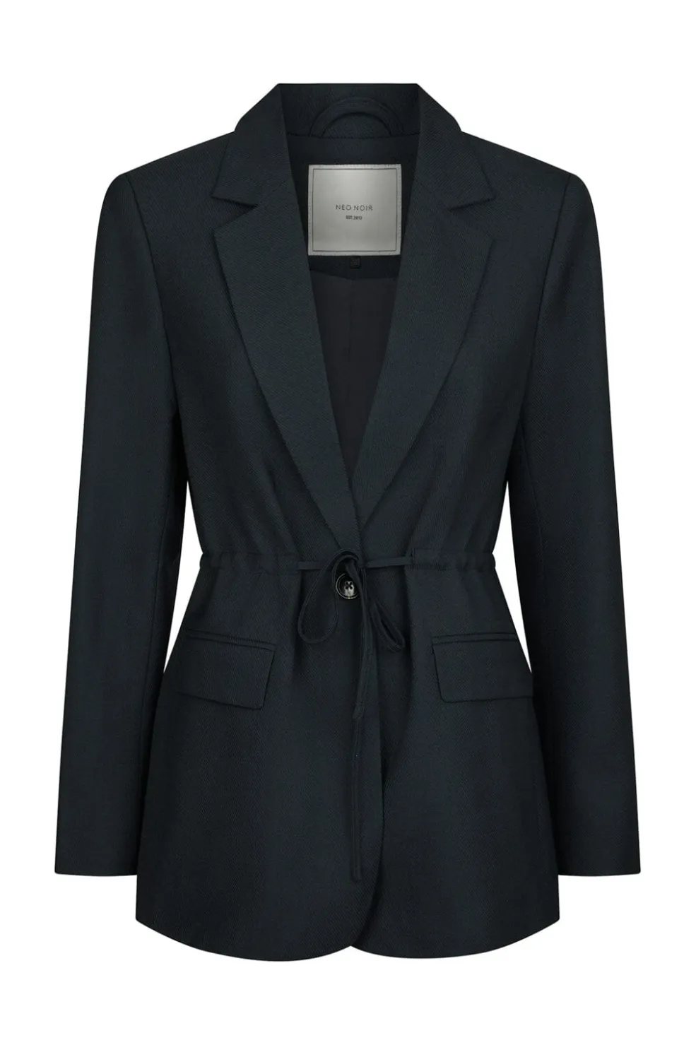 Mørkeblå blazer fra Neo Noir i en blød, vævet kvalitet. Blazeren har klassisk revers, lommer med klap og en praktisk snor i taljen, der giver mulighed for at justere pasformen.