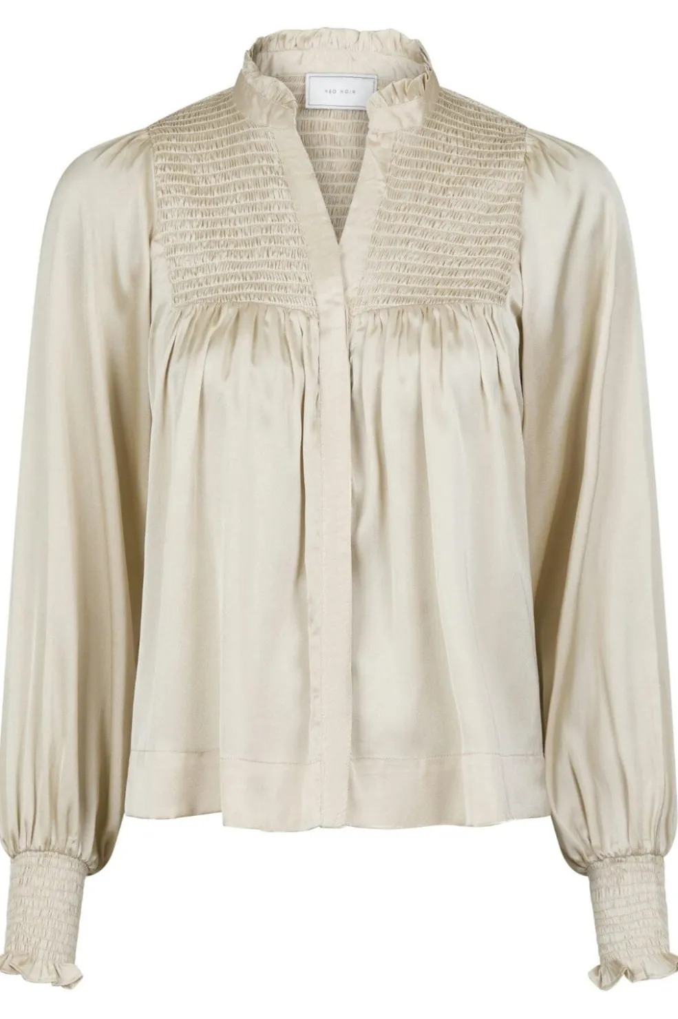 Satinbluse fra Neo Noir i champagnefarve. Blusen har rynkede detaljer ved skuldrene og smock-detaljer på brystet. De lange ærmer afsluttes med elastik ved håndleddene.