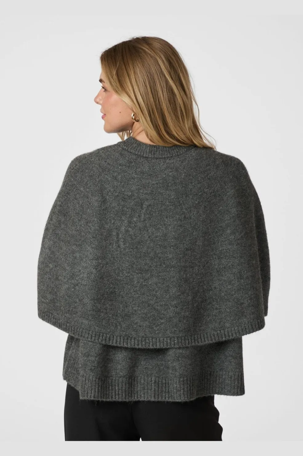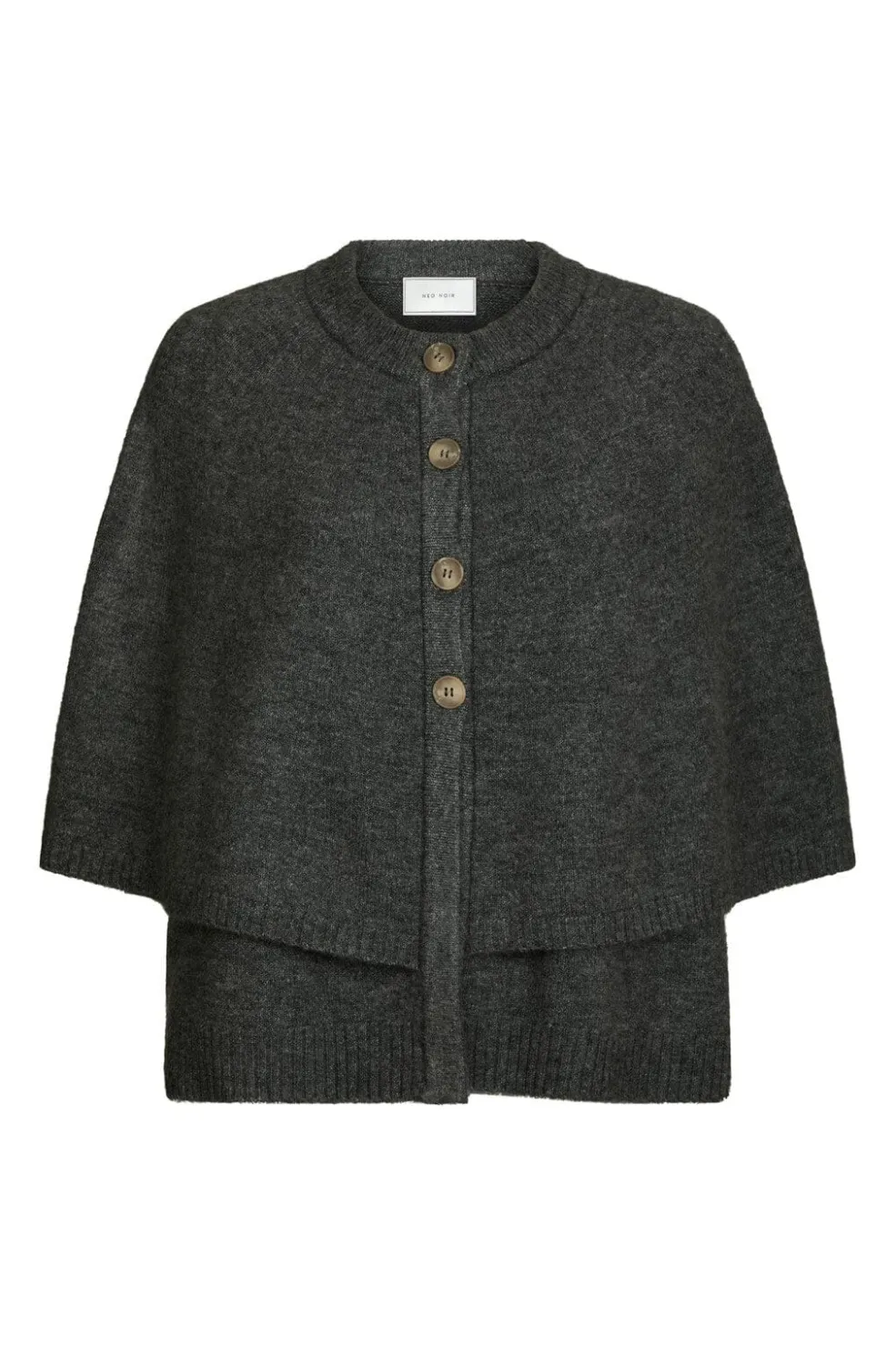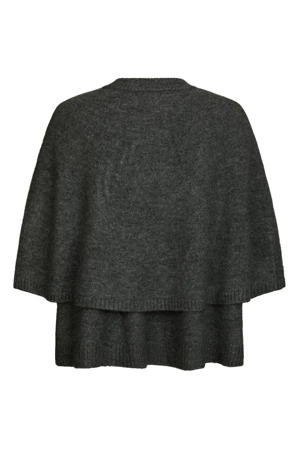 Grå kappe fra Neo Noir i dobbeltlagsstrik. Den løse pasform og den runde halsudskæring giver god bevægelsesfrihed, mens knapperne foran gør den nem at tage af og på.