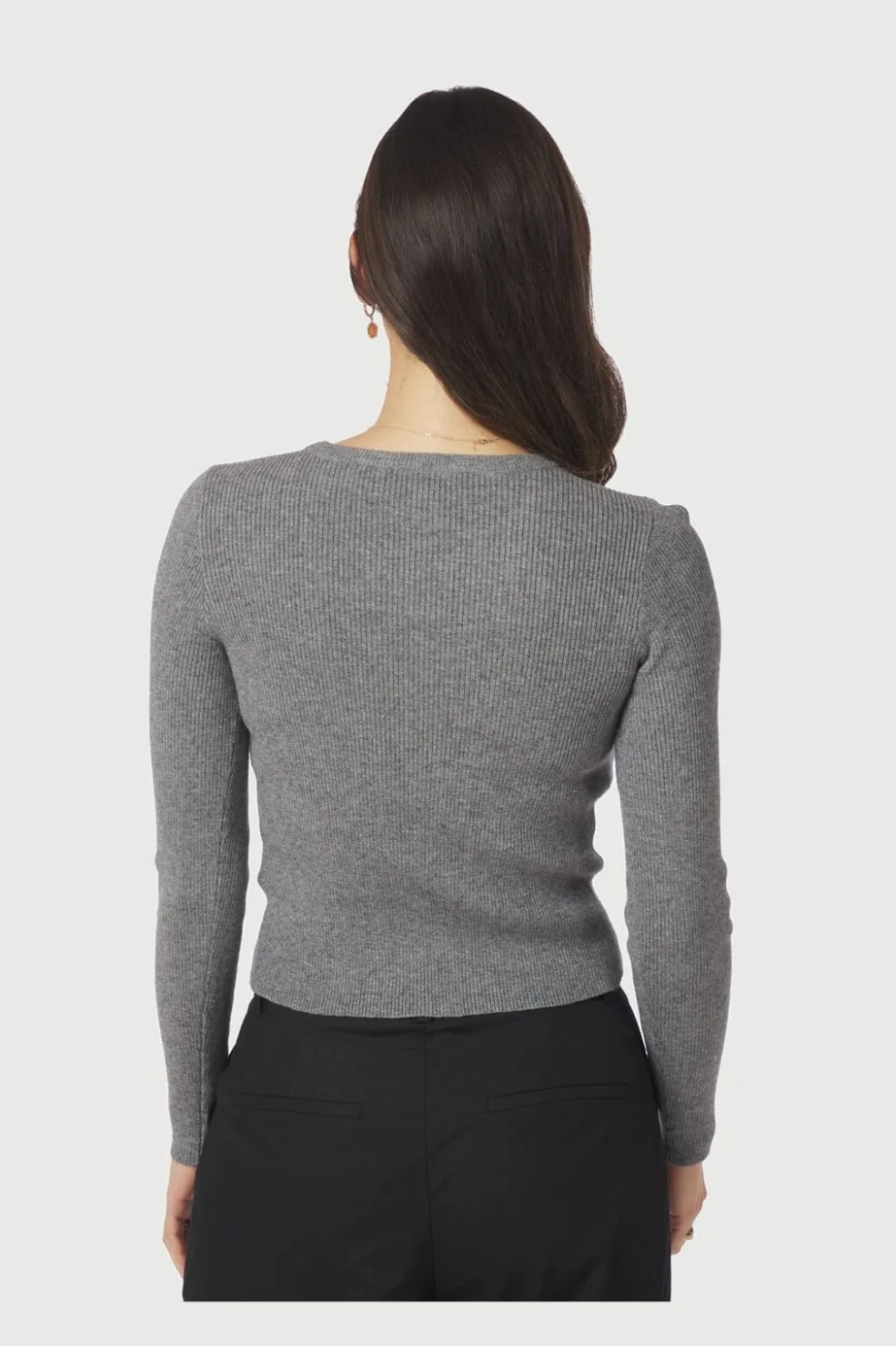 Mørkegrå meleret strikbluse fra Neo Noir med ribbet struktur. Blusen har en tætsiddende pasform og lange ærmer, der giver en kropsnær silhuet.