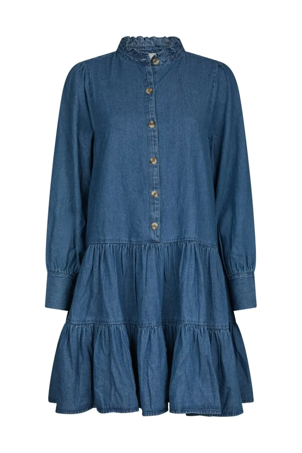 Blå denimkjole fra Neo Noir, lavet af 100 % bomuld. Kjolen har en høj hals med flæser, lange ærmer og et lagdelt skørt.
