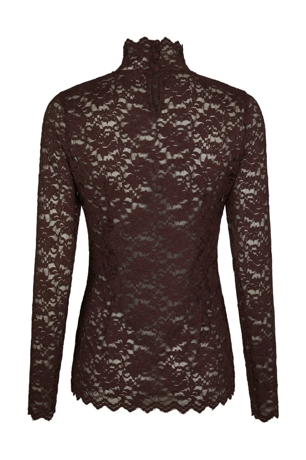 Bordeauxfarvet blondebluse fra Neo Noir med høj hals og bølget kant. Blusen har en figursyet pasform og er lavet af strækbart blondemateriale med blomstermønster.