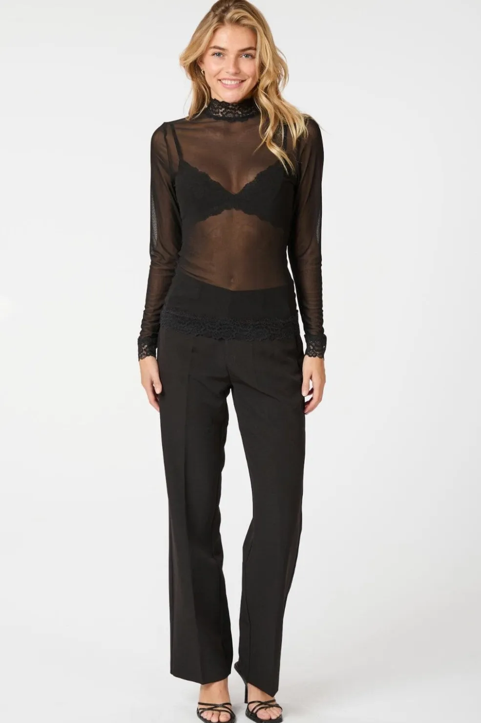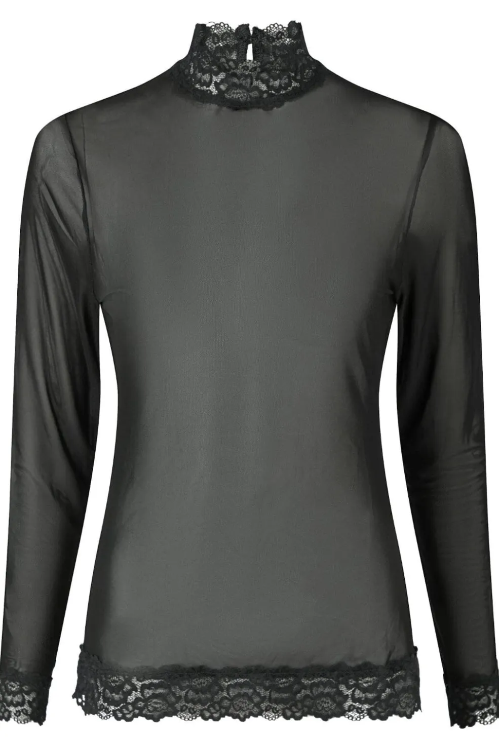 Sort meshbluse fra Neo Noir med blondedetaljer. Blusen har en høj hals med blondekant og lange ærmer med blondekanter ved håndleddene.