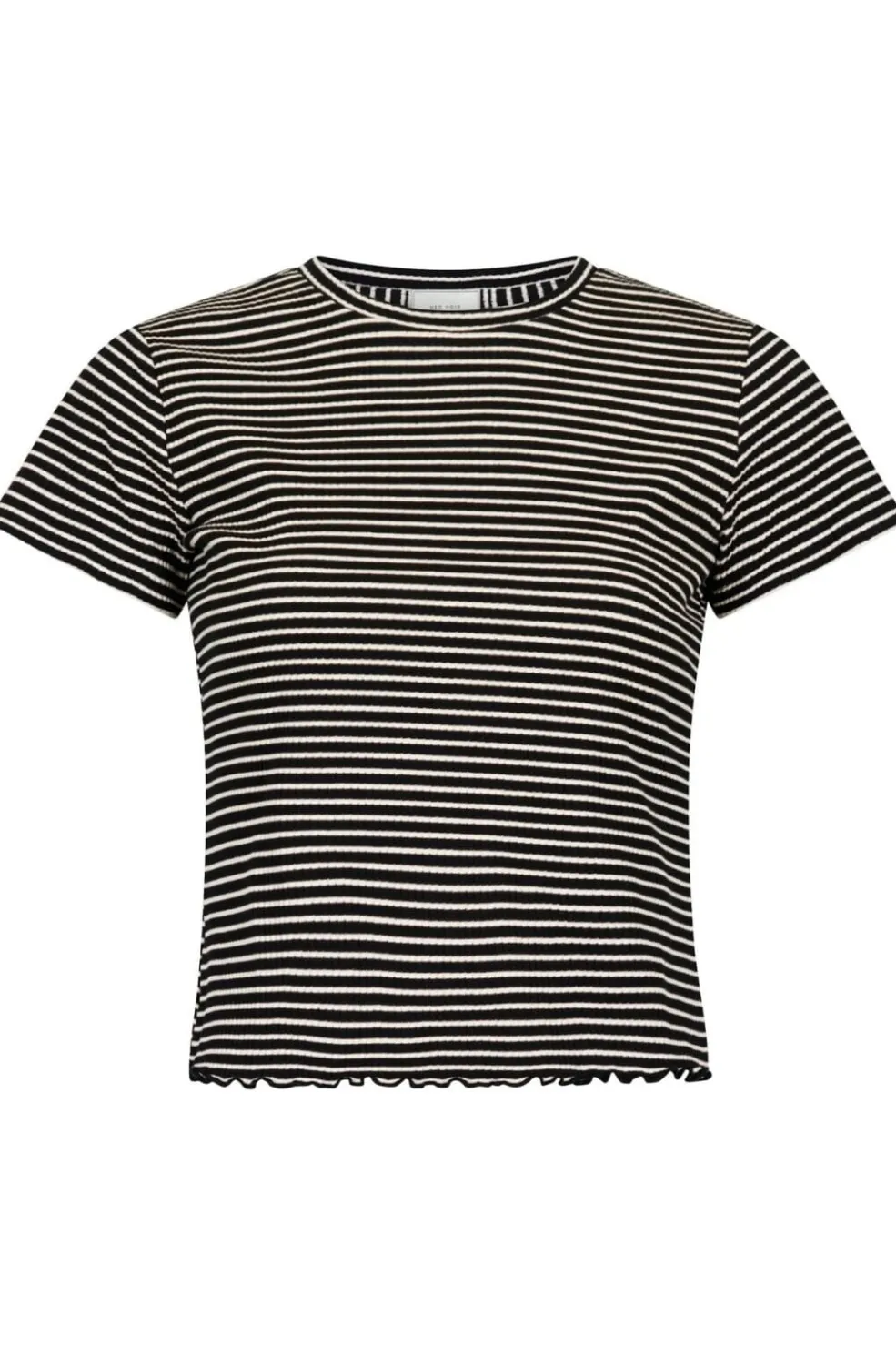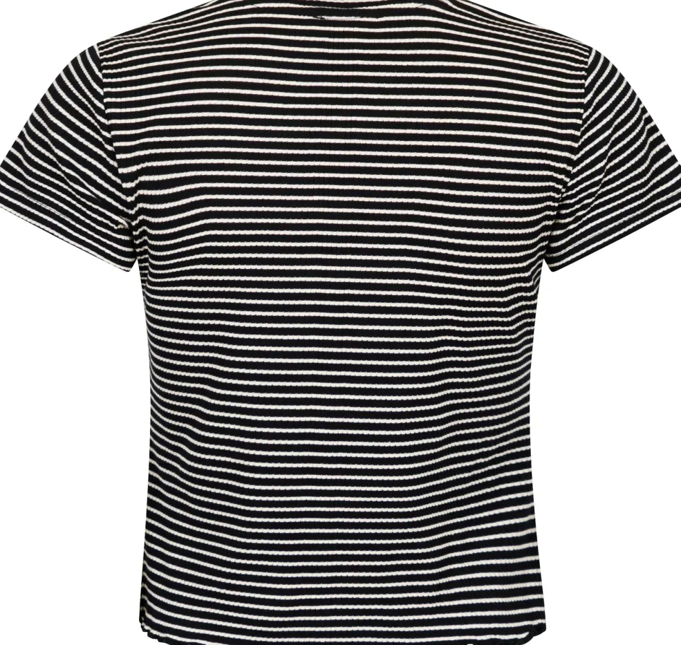 Stribet t-shirt fra Neo Noir med sort og hvidt mønster. T-shirten har en rund halsudskæring og bølget kant forneden.