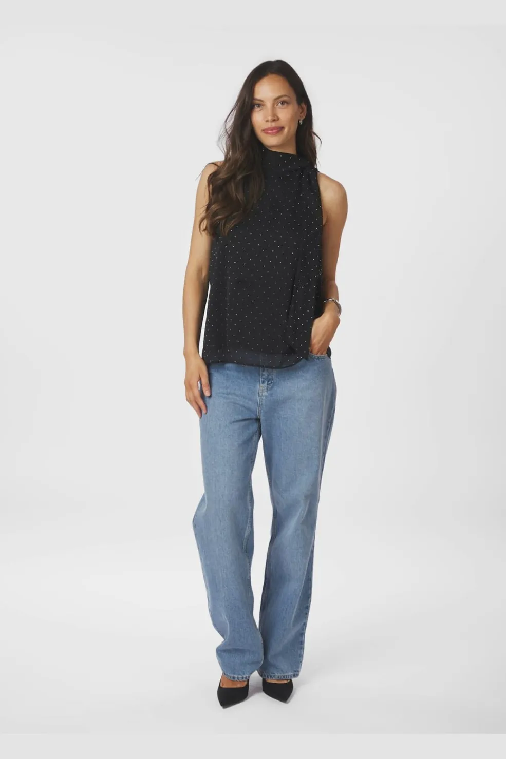 Sort top fra Neo Noir med hvide prikker og høj hals. Toppen har en løs pasform og er lavet af chiffon med påsyede sten og bindebånd ved halsen.