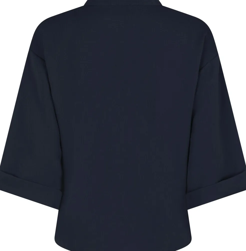 Mørkeblå bluse fra Neo Noir i blød crepe. Den har en løs pasform med boxy snit, v-hals og 3/4 ærmer med opsmøg.