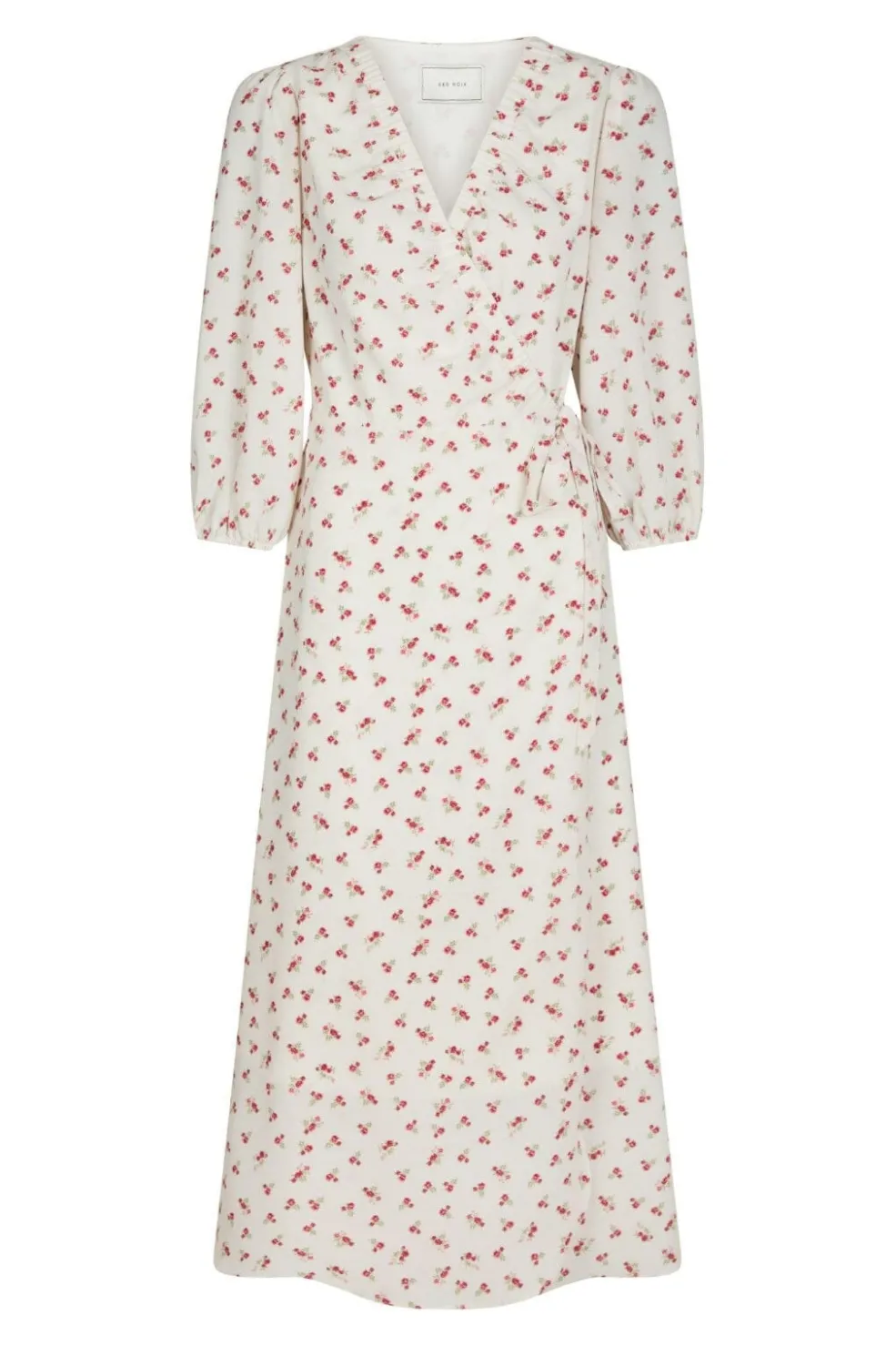 Hvid kjole fra Neo Noir med røde blomster. Kjolen har V-hals og 3/4 ærmer. Bindebåndet i taljen giver mulighed for at tilpasse pasformen.