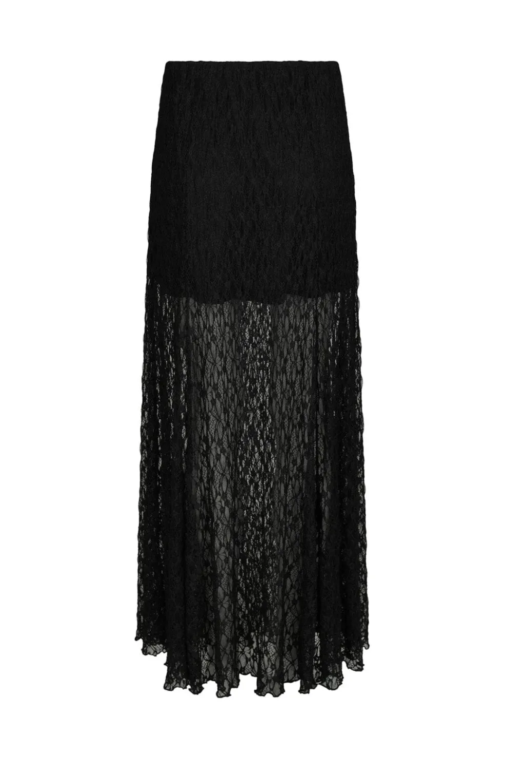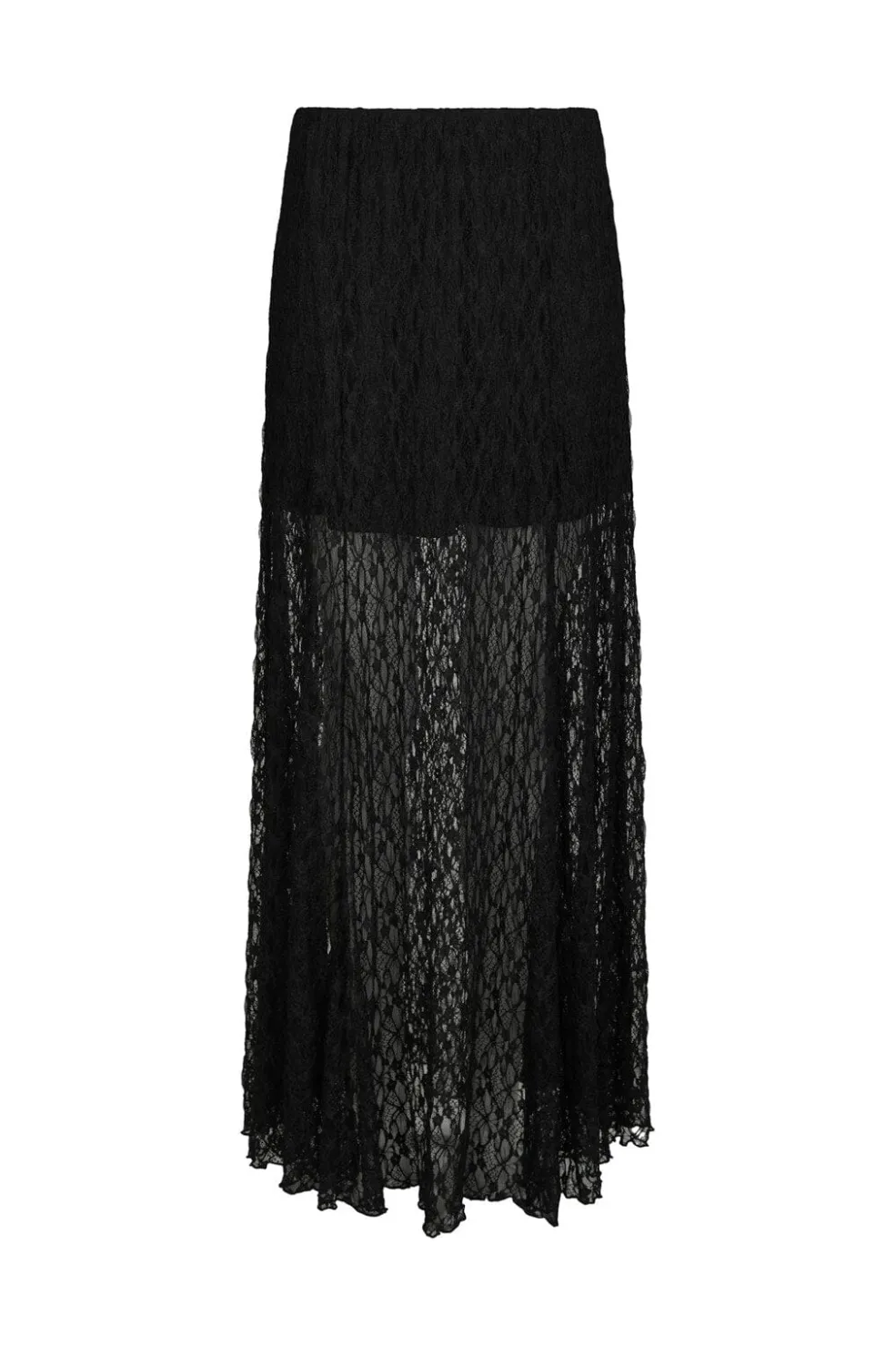 Sort blondekjole fra Neo Noir med lang længde. Nederdelen har en kortere underkjole og et gennemsigtigt blondeovertræk med blomstermønster. Den har elastik i taljen.
