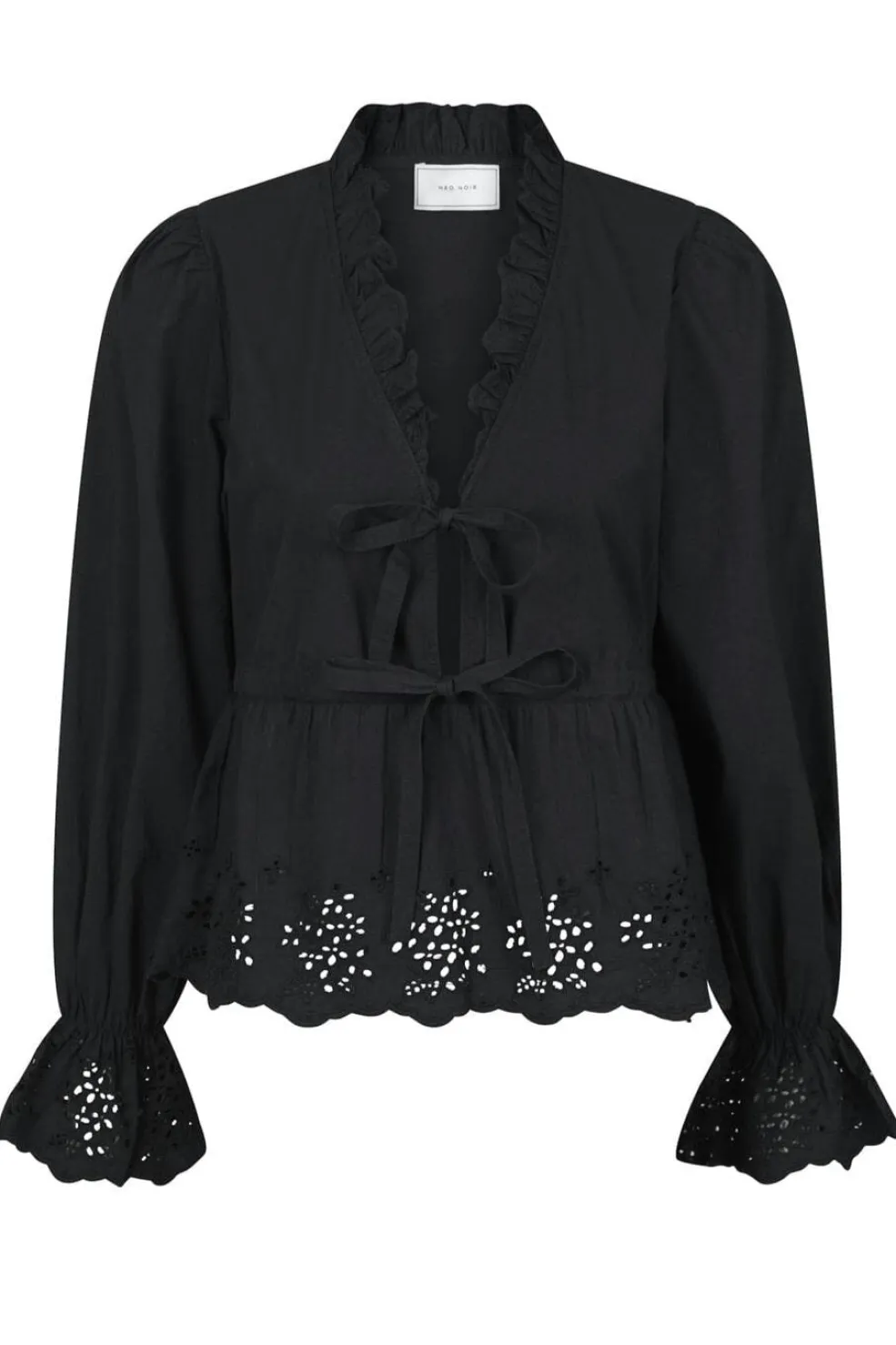 Sort bluse fra Neo Noir med broderede kanter og flæsedetaljer. V-halsudskæring med snøredetaljer foran og lange ærmer med rynkede manchetter.