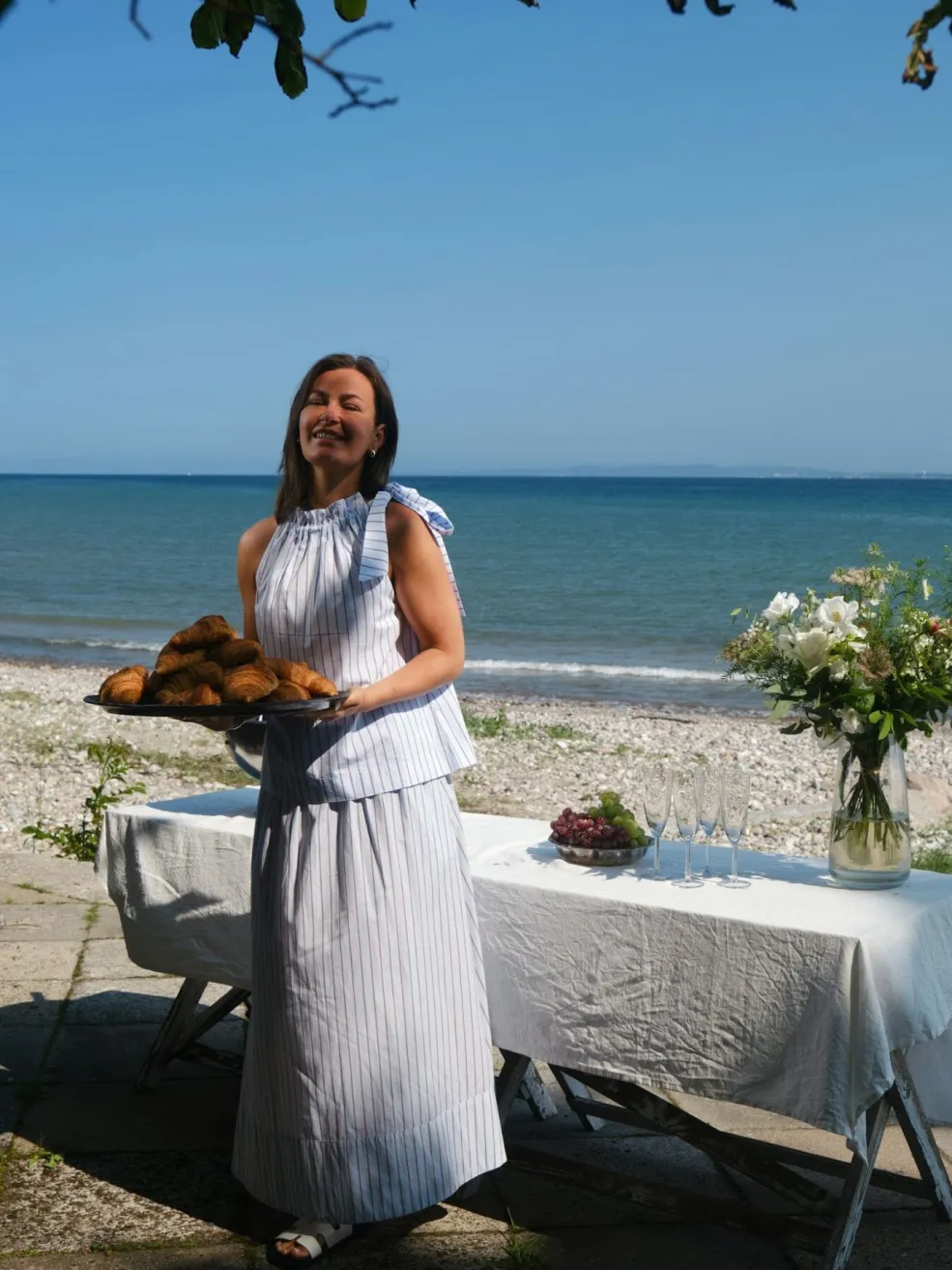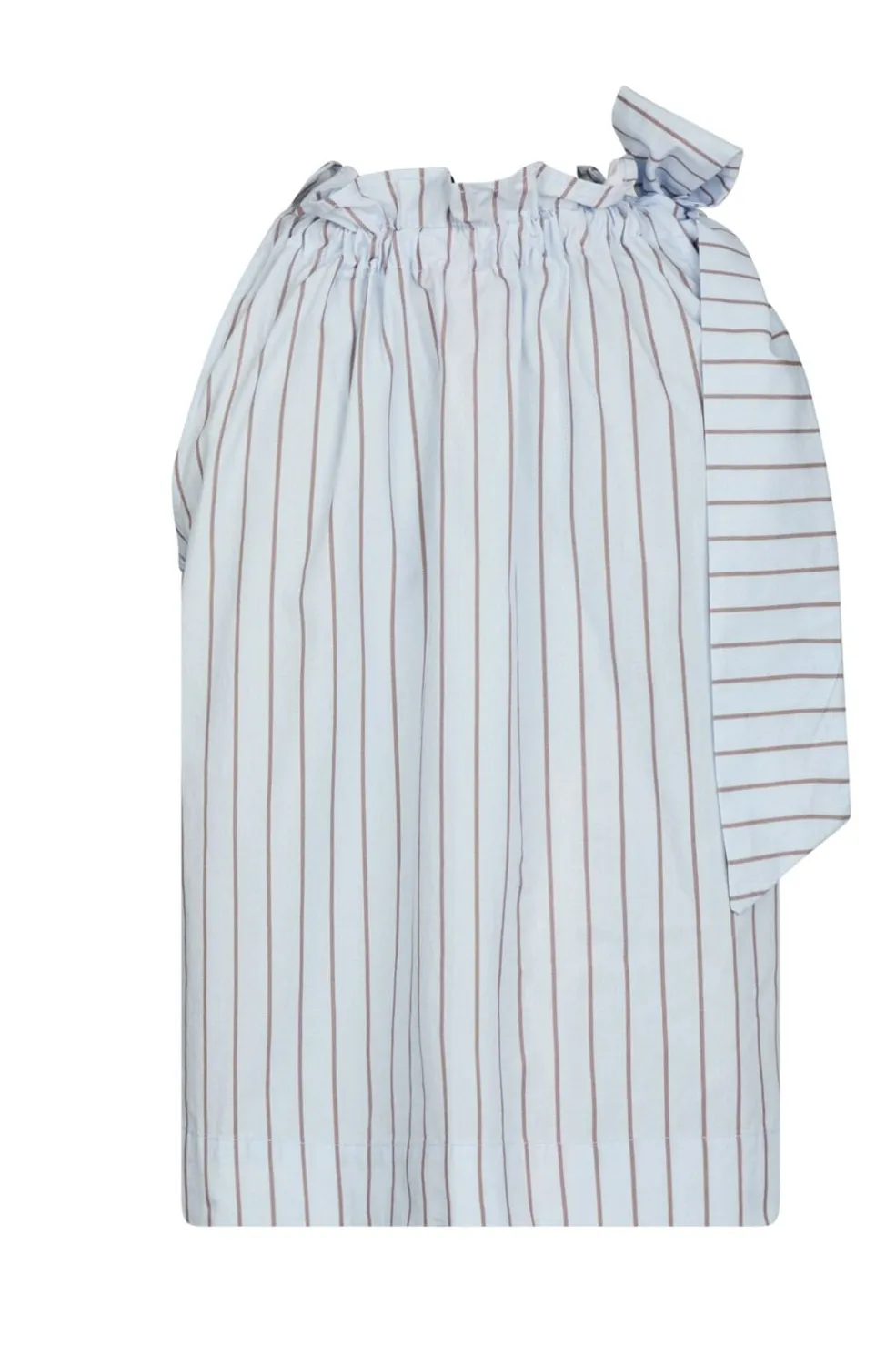 Stribet top fra Neo Noir i lyseblå med brune striber. Toppen har en halterneck med bindebånd og en sløjfedetalje på skulderen.
