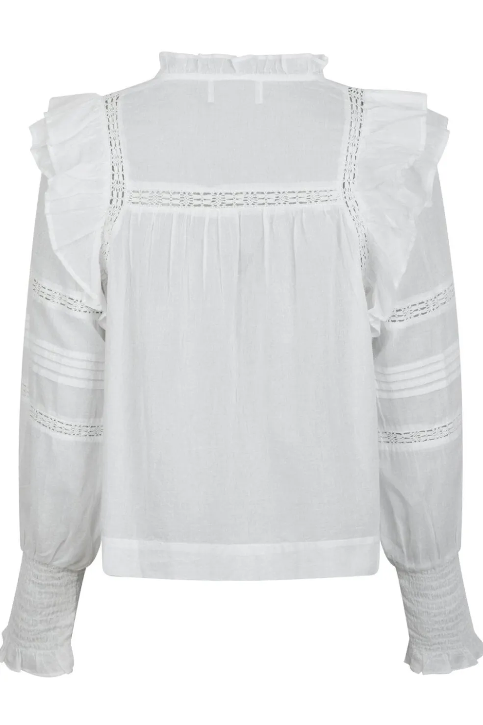 Hvid bluse fra Neo Noir i let bomuldsvoile. Blusen har rynkede detaljer ved v-udskæringen og horisontale blondeindsatser over brystet og ærmerne.