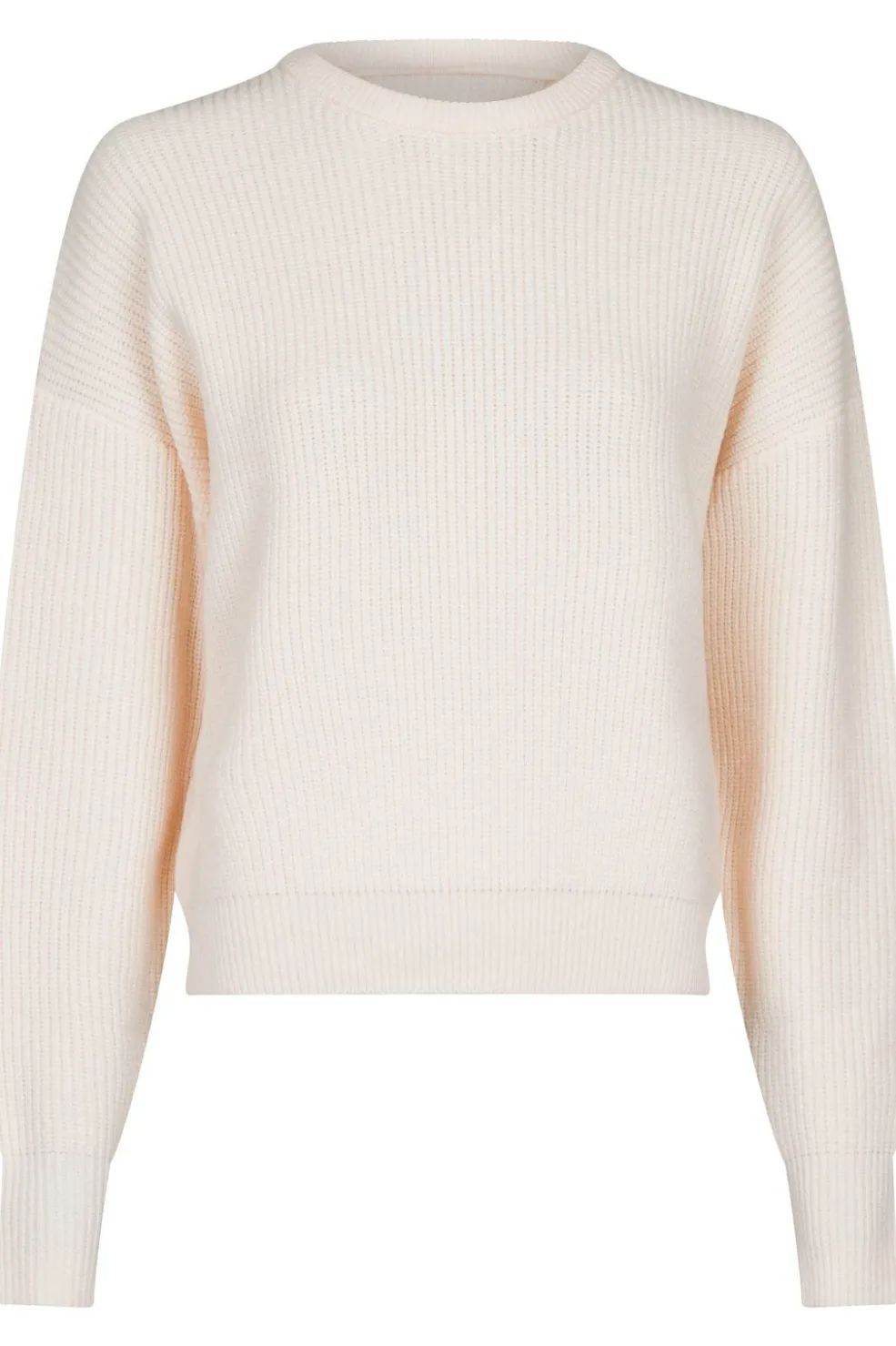 Strikbluse fra Neo Noir i off-white. Den har en løs pasform med rund hals og brede ærmer. Den ribstrikkede struktur giver blusen et markant udtryk.
