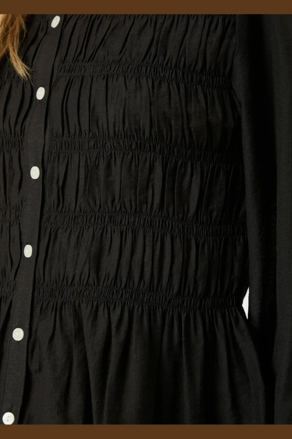 Sort smockbluse fra Neo Noir med høj hals og knaplukning foran. Blusen har et slim fit-snit og strukturerede smockdetaljer, der giver et feminint udtryk.