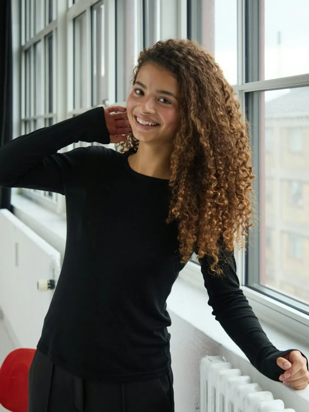 Sort ribbluse fra Neo Noir i en blød blanding af lyocell og uld. Blusen har en tætsiddende pasform med lange ærmer og rund halsudskæring.