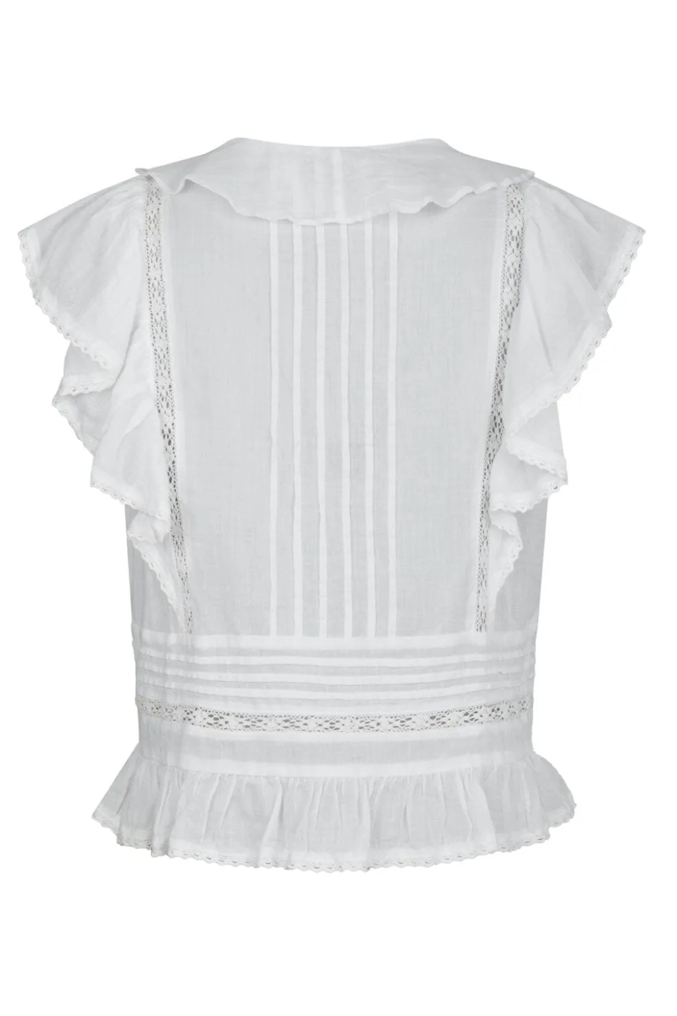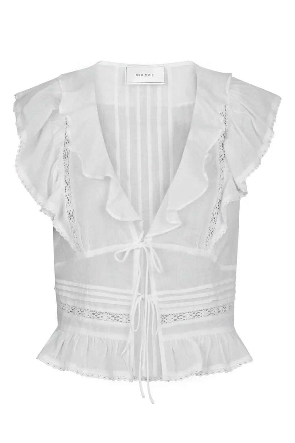 Hvid voile-top fra Neo Noir med flæser og bindebånd. Toppen har en dyb V-udskæring med snørebånd foran og dekorative flæsekanter ved ærmerne og forneden.