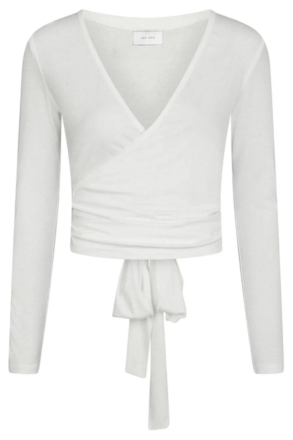 Hvid slå-om-bluse fra Neo Noir i blød jersey. Blusen har V-udskæring og bindebånd i taljen, der skaber en tilpasset pasform.