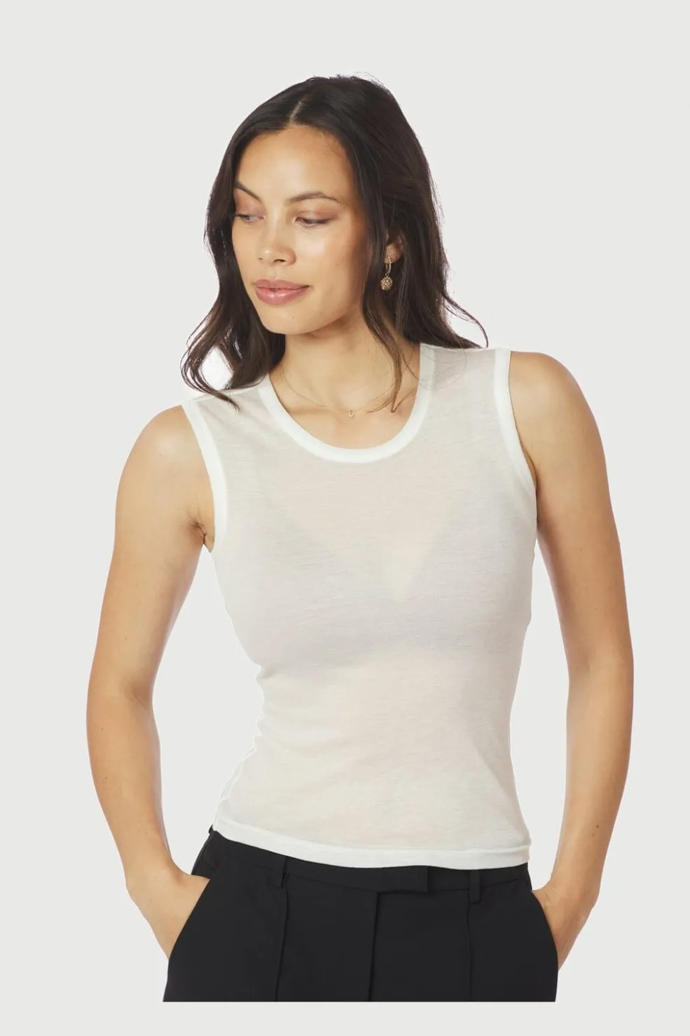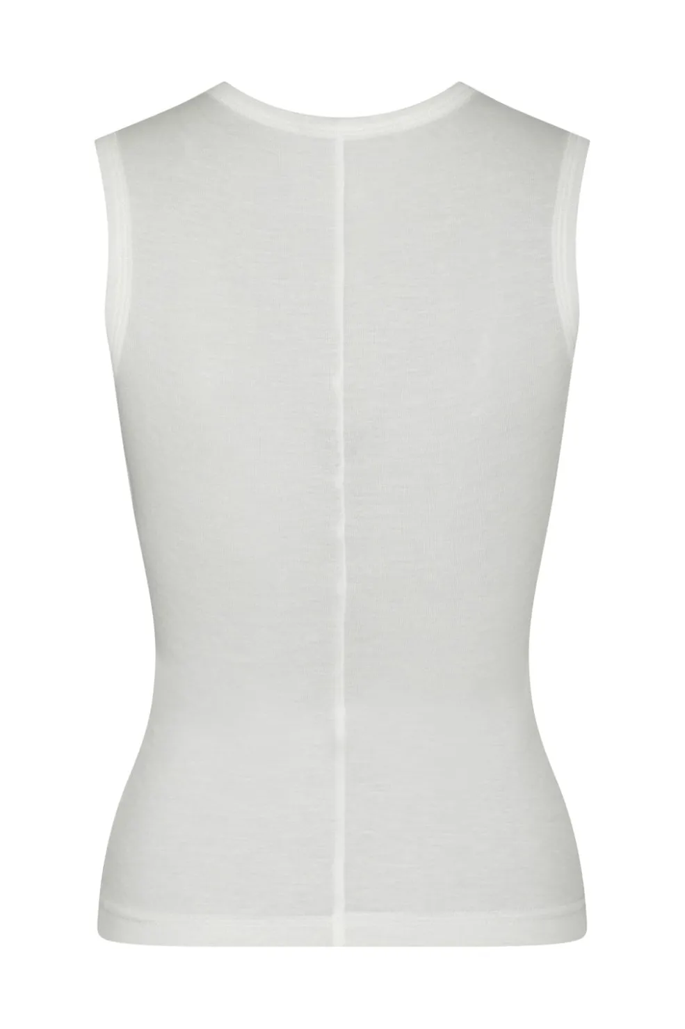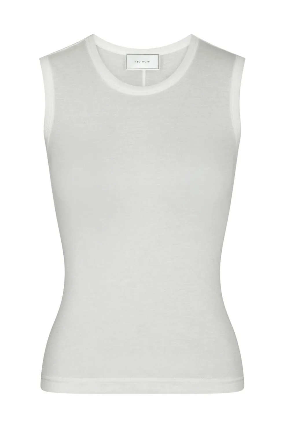 Hvid ribstrikket top fra Neo Noir med rund hals og ærmeløst design. Toppen har en tætsiddende pasform og en fin ribstruktur i stoffet.