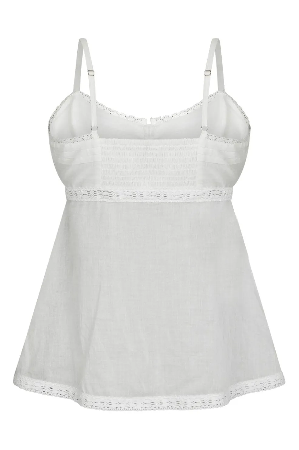 Hvid voile-top fra Neo Noir med smock-design på ryggen. Toppen har justerbare stropper og blondedetaljer langs kanterne. Knaplukning i fronten giver nem af- og påtagning.