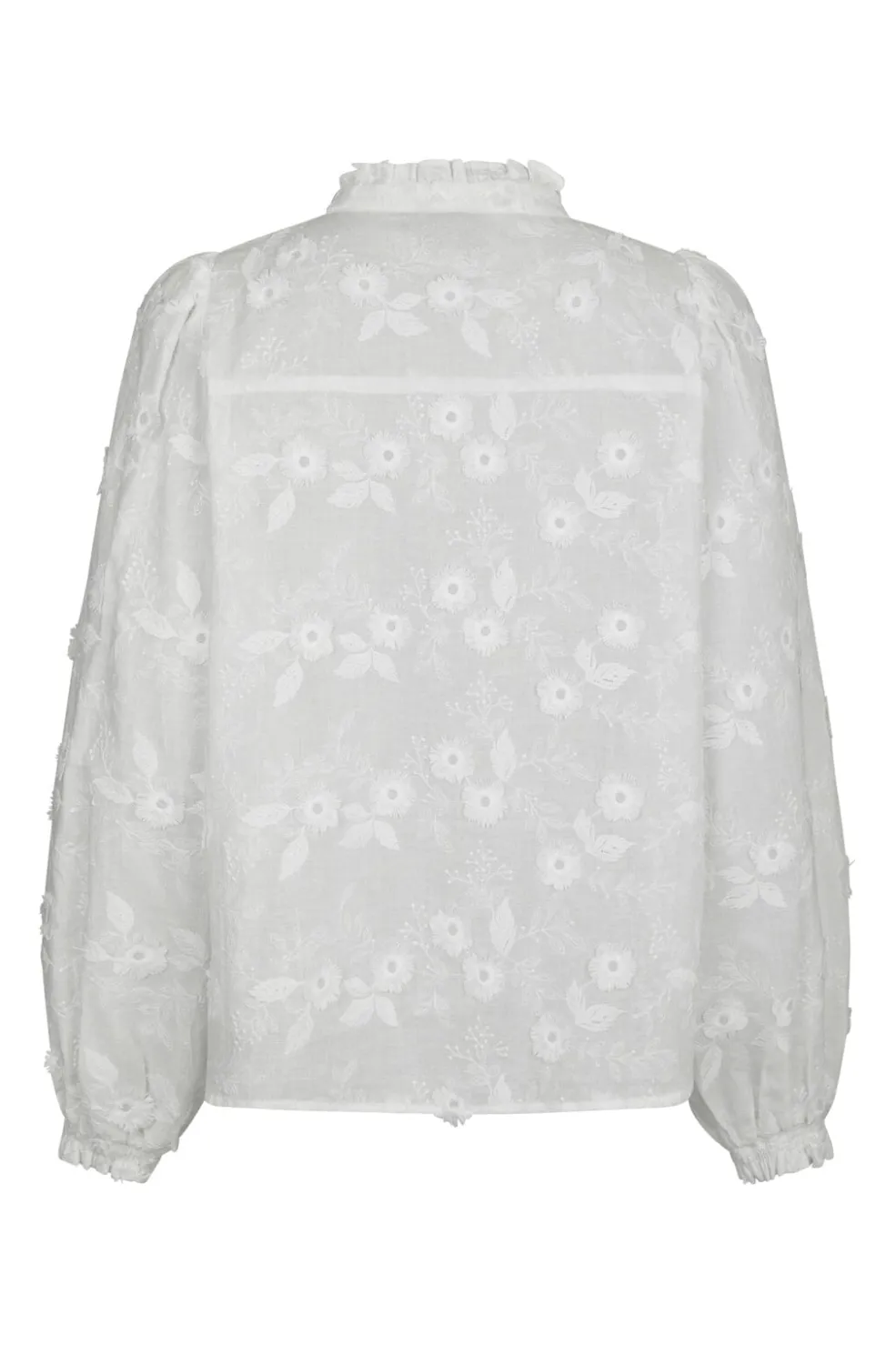 Hvid skjorte fra Neo Noir med broderet blomstermønster over hele skjorten. Skjorten har en høj hals med flæsekant og lange ærmer med elastiske manchetter.