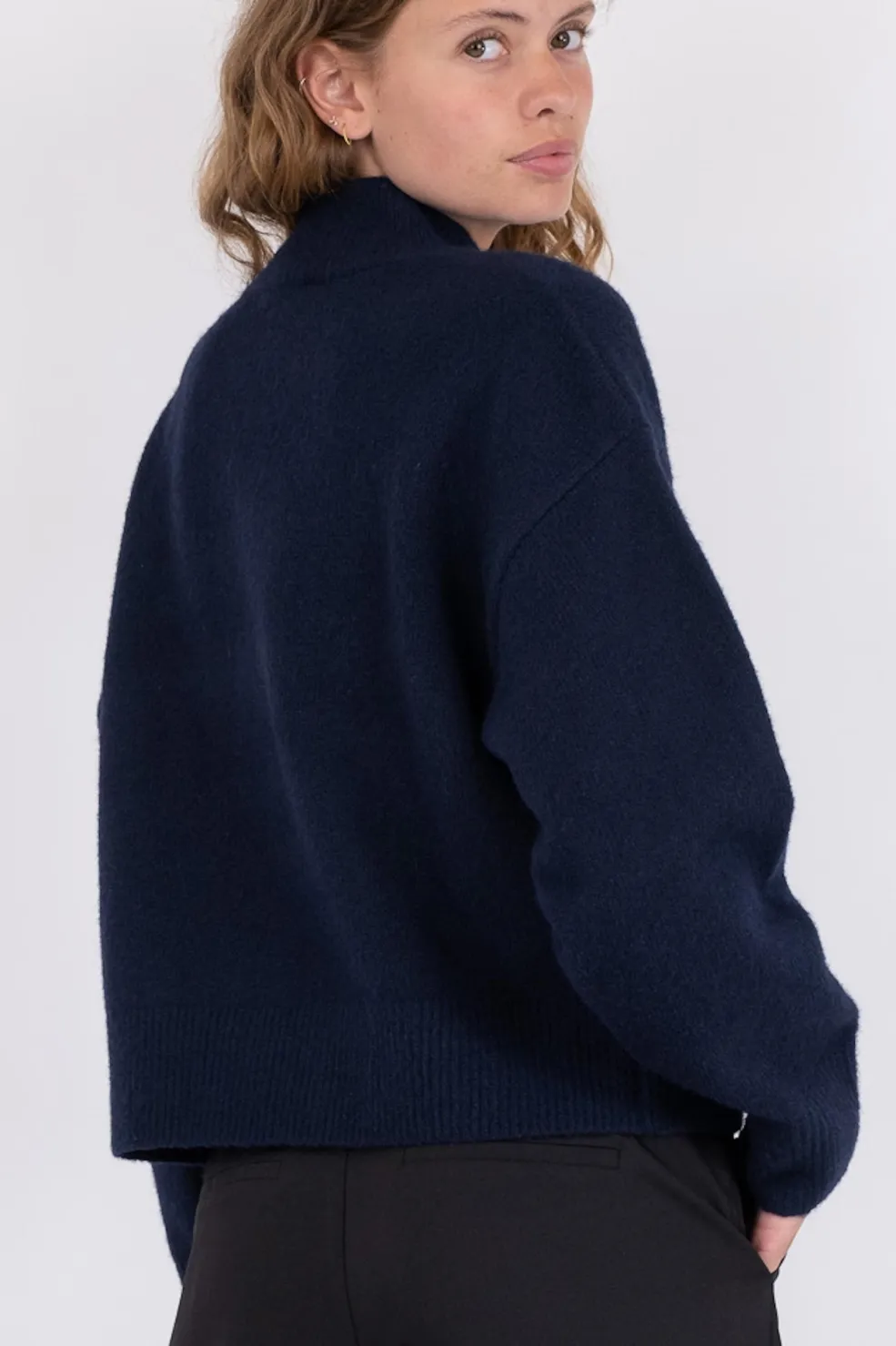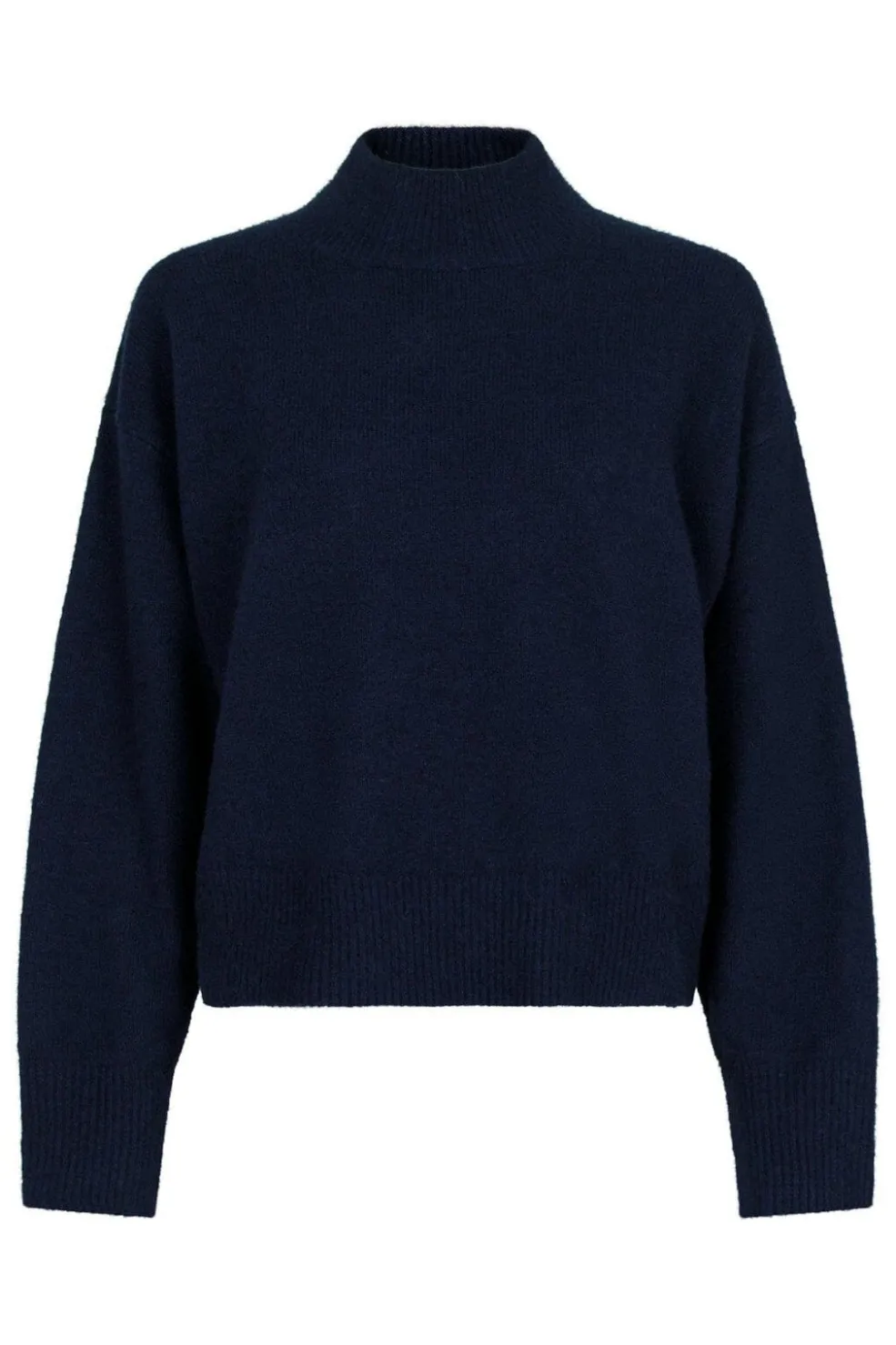 Strikbluse i mørkeblå fra Neo Noir med høj hals og cropped længde. Den har en regular fit og lange ærmer, der giver god bevægelsesfrihed.