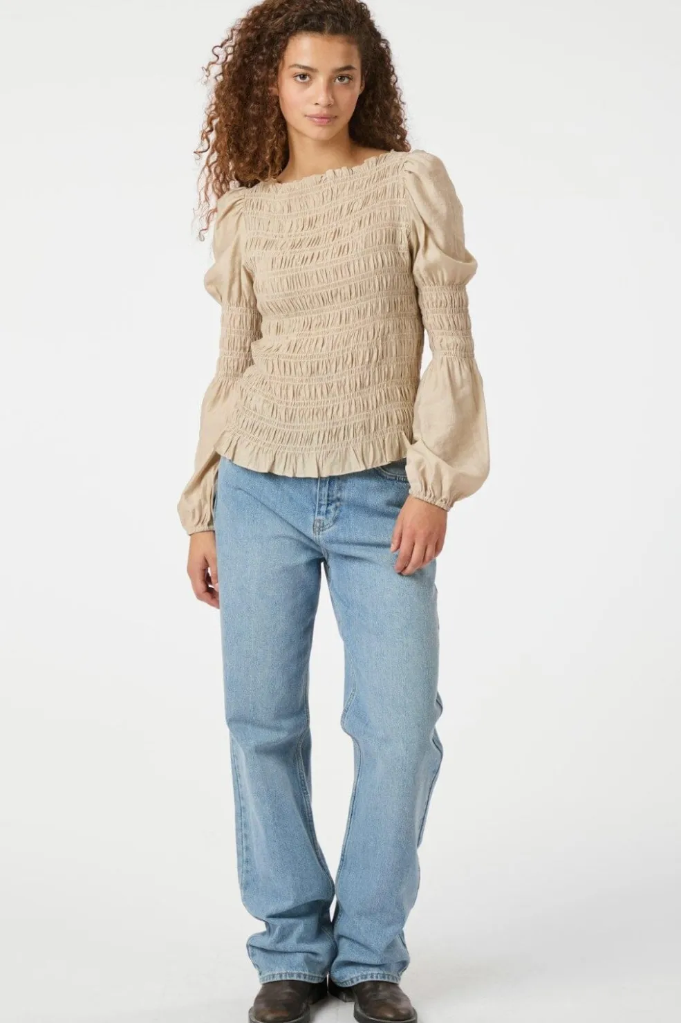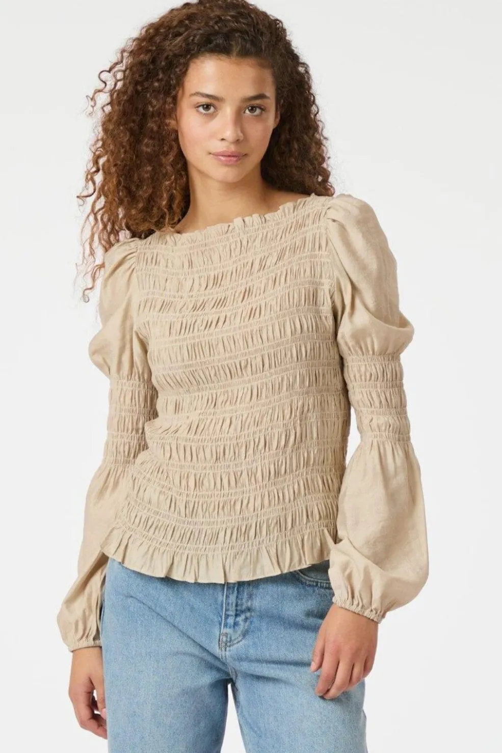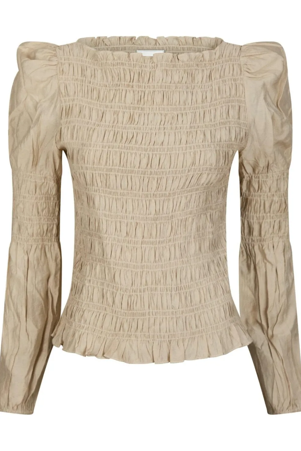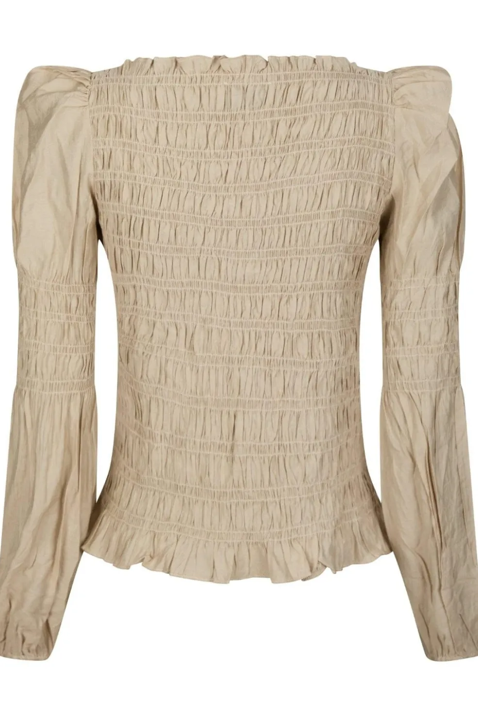 Sandfarvet skjorte fra Neo Noir med smock-detaljer. Den har en firkantet halsudskæring og lange ærmer med pufeffekt. Stoffet er rynket over hele kroppen med en flot struktur.