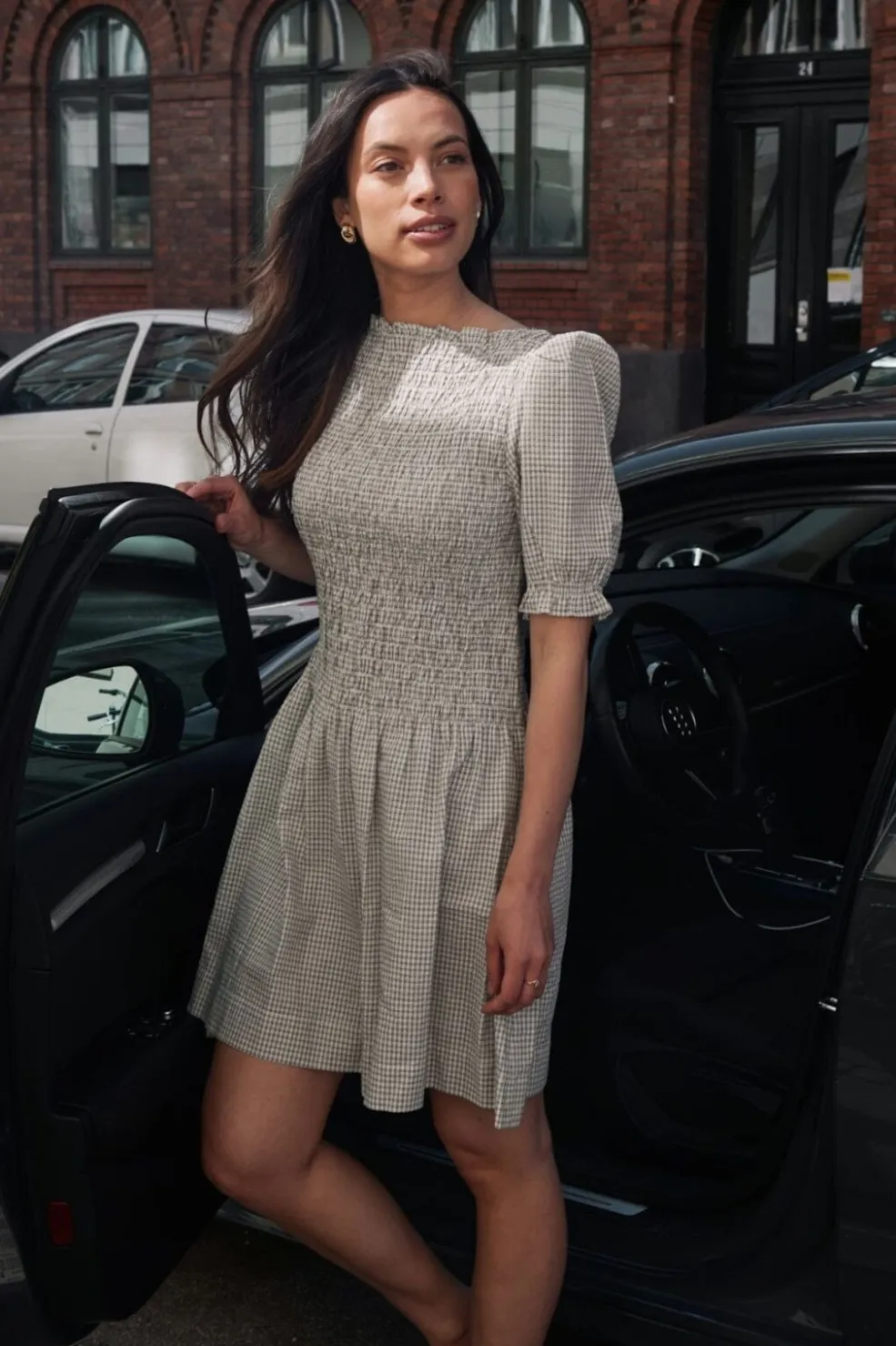 Ternet kjole fra Neo Noir i creme. Kjolen har en smuk overdel med høj hals og korte pufærmer. Det lille ternede mønster giver kjolen et enkelt og stilrent udtryk.