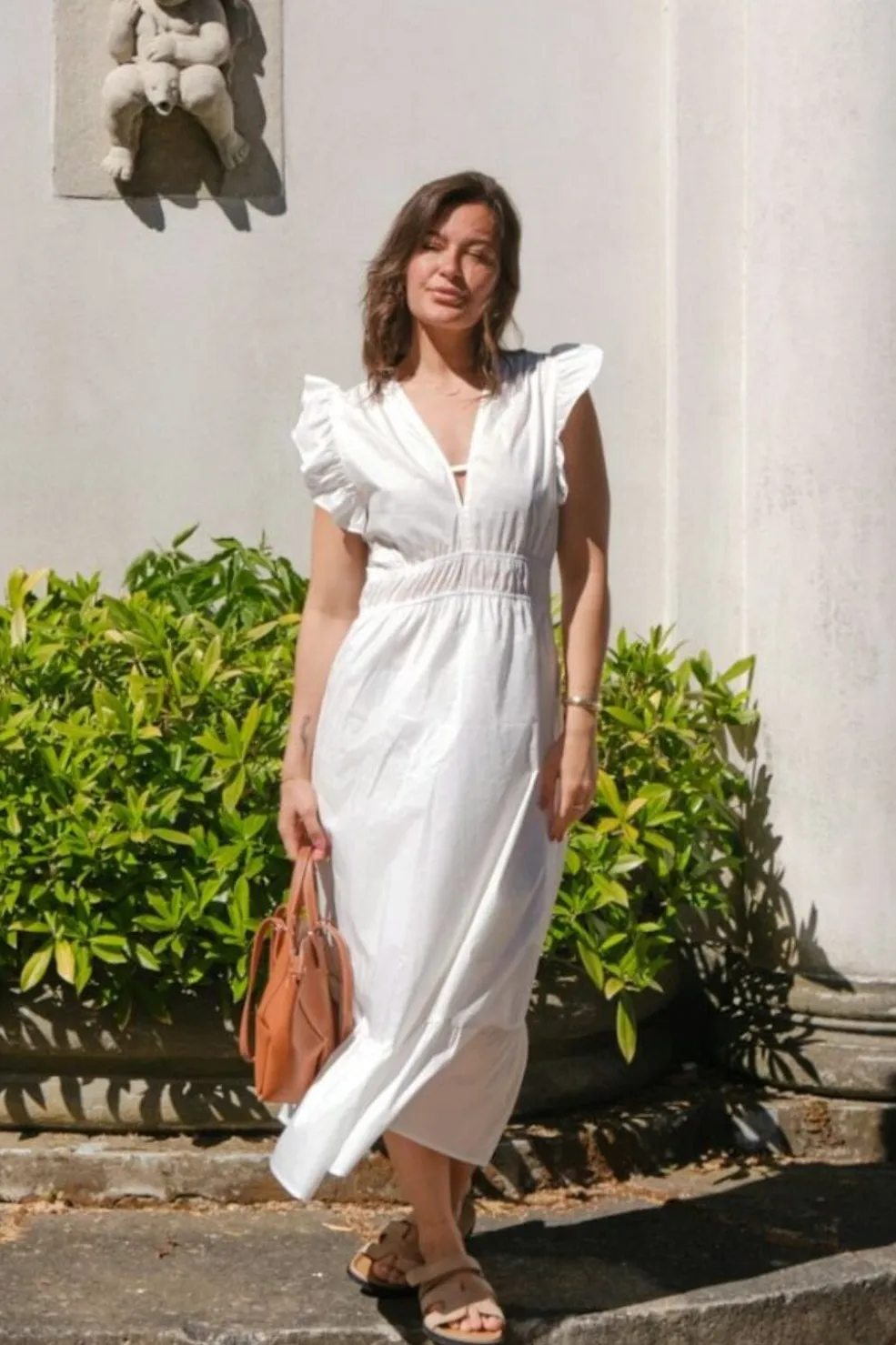 Hvid poplinkjole fra Neo Noir med løs pasform og elastisk talje. Kjolen har flæser ved ærmerne og nederste kant samt en V-udskæring i halsen.