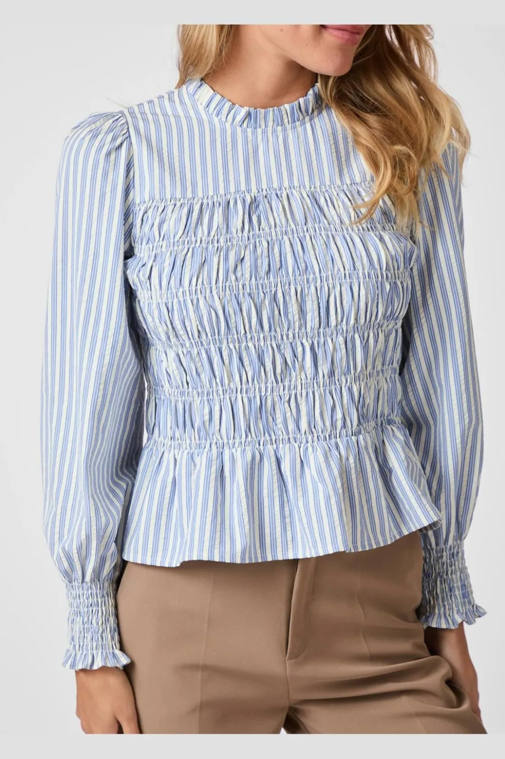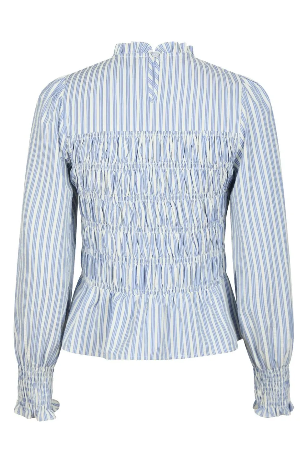 Lyseblå stribet bluse fra Neo Noir med smock-design. Blusen har rynkeeffekt fra brystet og ned, rund halsudskæring og lange ærmer med manchetter.