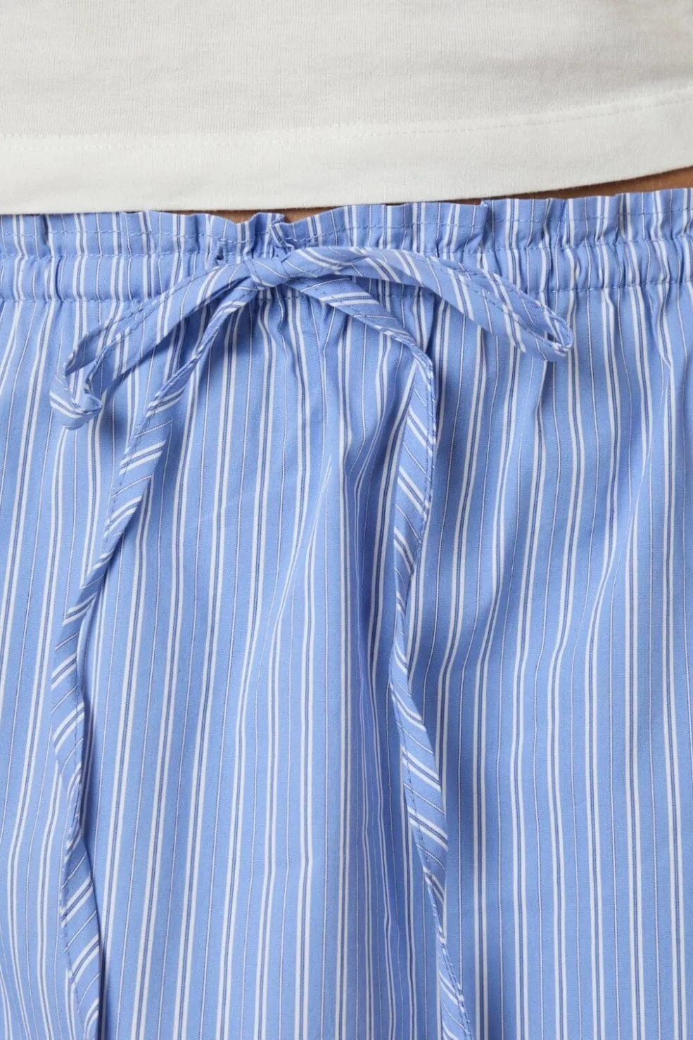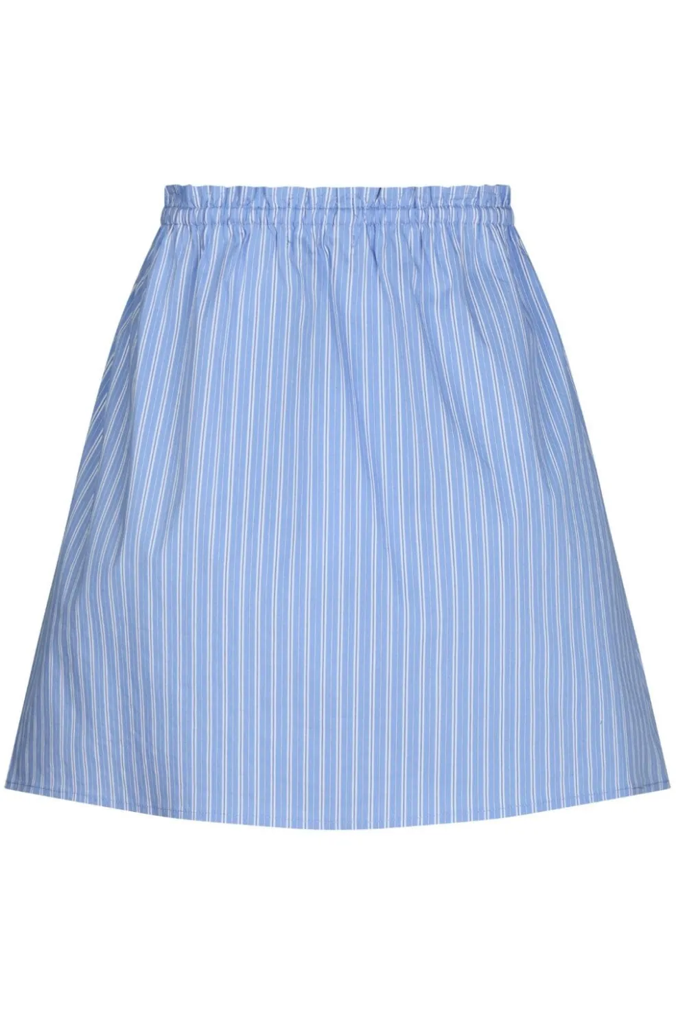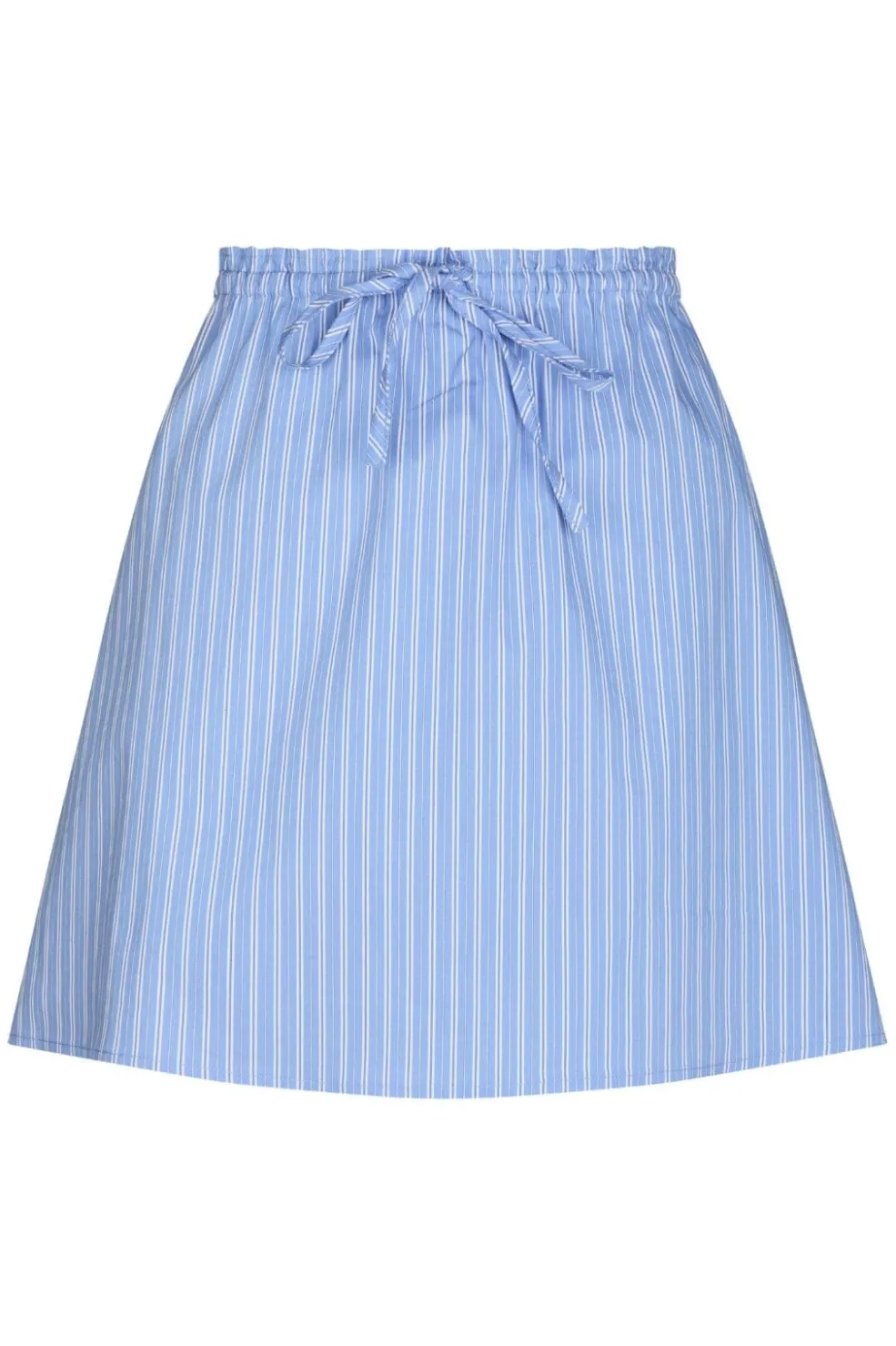 Stribet nederdel fra Neo Noir i lys blå med hvide striber. Den har flæsedetaljer og bindebånd i taljen, der giver mulighed for at justere vidden.